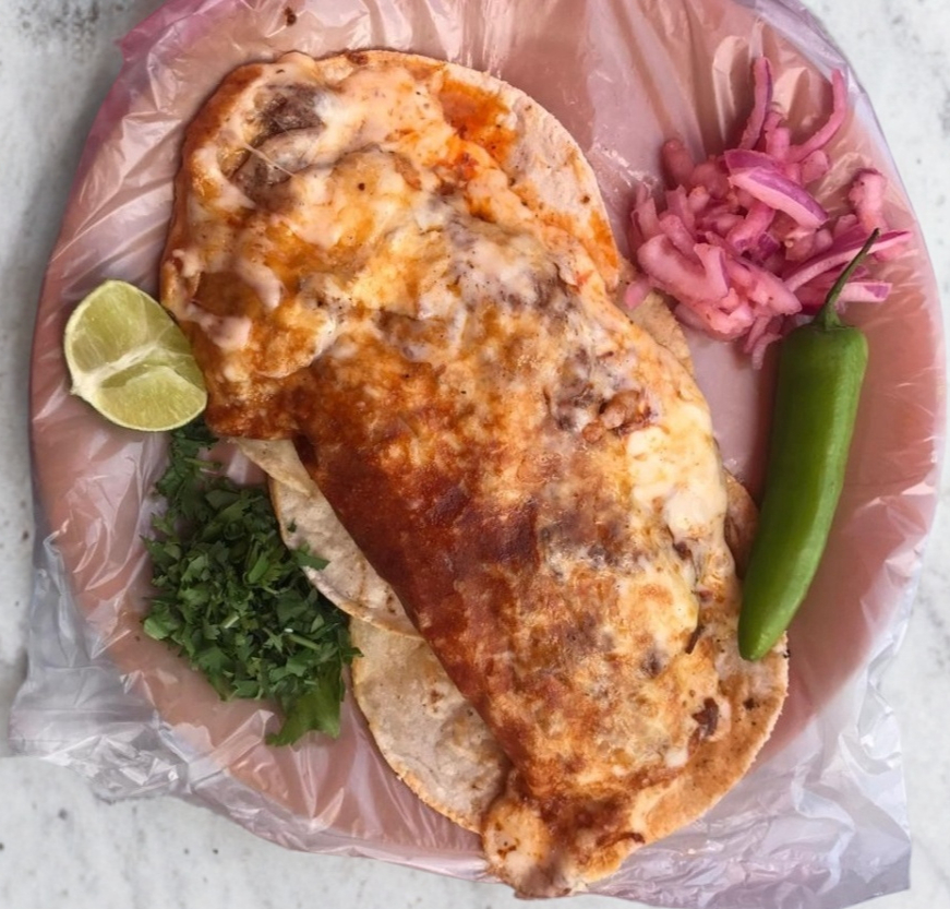 Doble tortilla de maíz con queso gratinado y birria. Acompañado de salsa, cebolla, limón y chile.