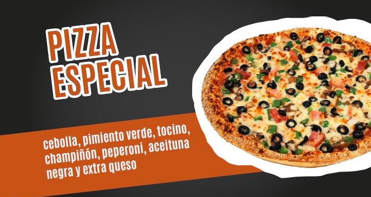 Peperoni, champiñon, tocino, cebolla, pimiento verde, aceitunas negras y extra queso.