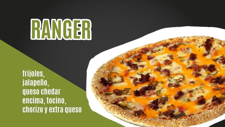 Peperoni, champiñón , pimiento verde ,cebolla, aceituna negra ,tocino y extra queso