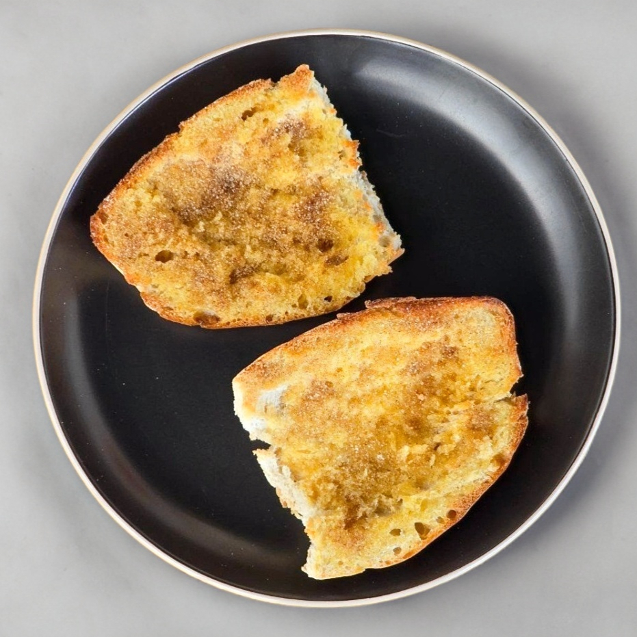 Bolillo del día untado con mantequilla, espolvoreado con azúcar y canela. Entrañable y con sabor a casa.