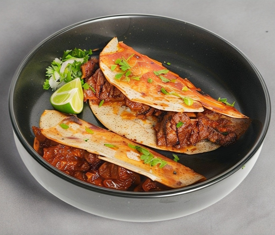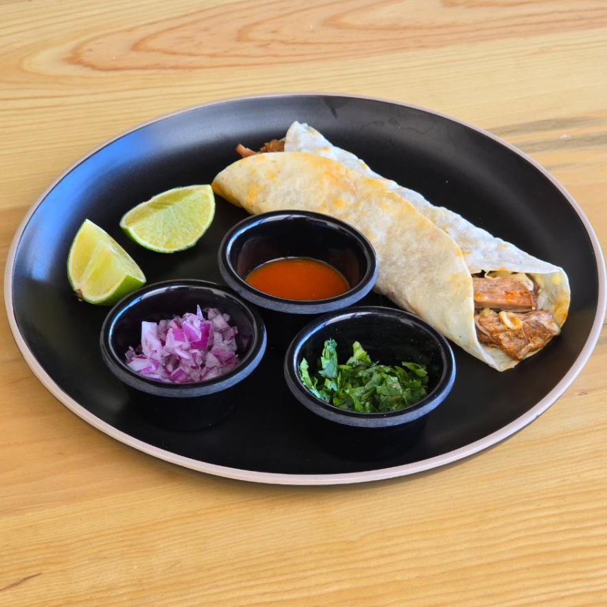 Tortillas de maíz con queso ranchero rellena de barbacoa de res en forma de sincronizada. Auténtica y deliciosa.