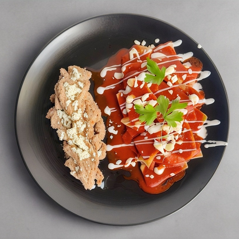 Totopos crujientes bañados en salsa roja o verde de tu elección, coronados con cebolla, queso ranchero y un toque de crema fresca. Acompañados de un huevo estrellado y frijoles refritos espolvoreados con queso. Tradición servida al plato.