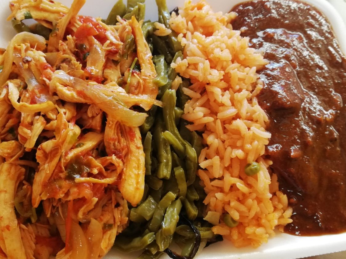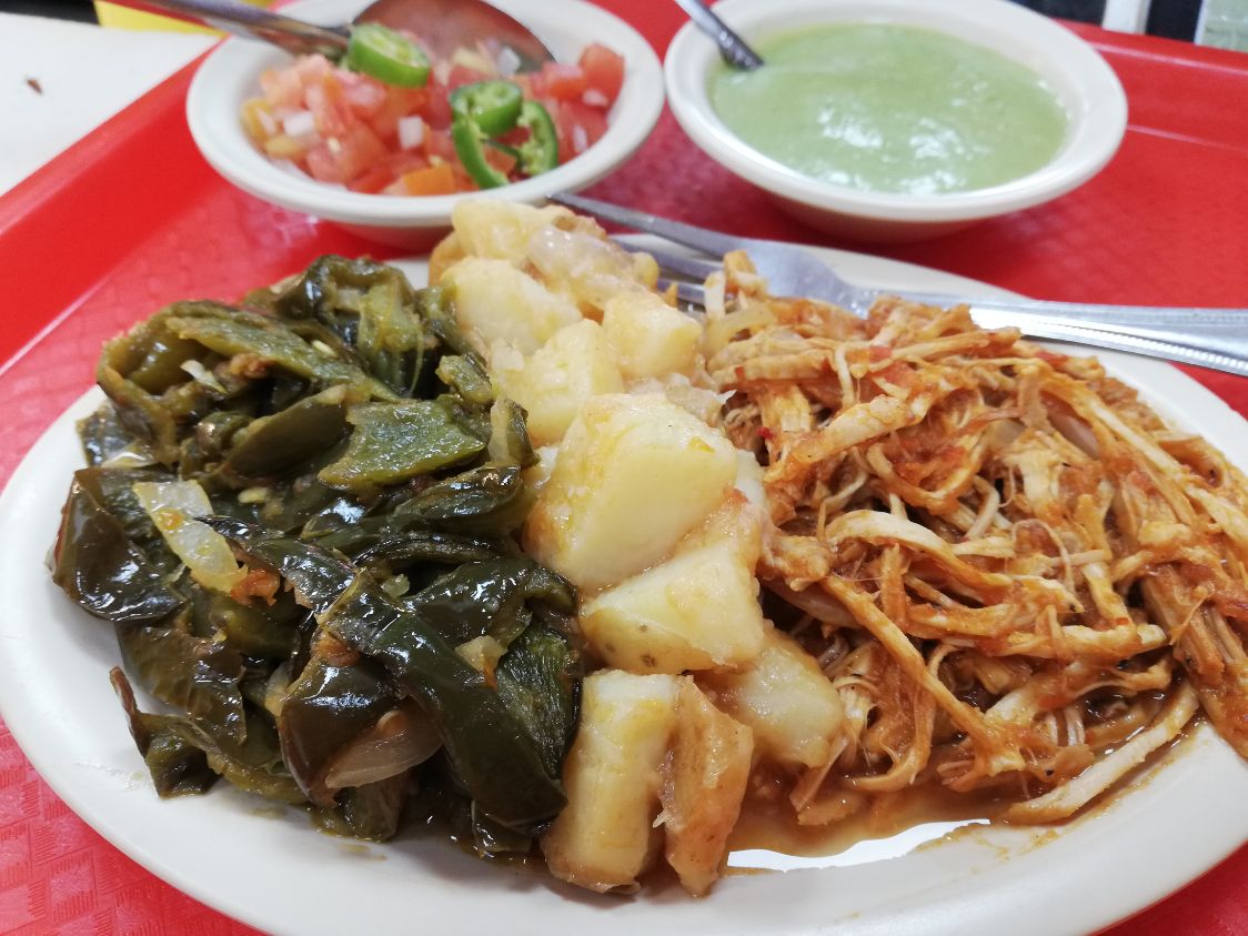 Cont. 2 carnes y 2 guarniciones: Arroz, frijoles, Chicharrón verde y rojo de duro, carnitas verdes y rojas, desebrada, pollo, bistec, molida, picadillo, papá, raja, nopales, mole verde y rojo, costilla. AGUA: del día