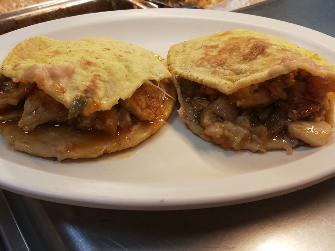Guisados: Chicharrón verde y rojo, Carnitas verdes y rojas, picadillo, chorizo, adobada rajas, nopales, bistec, arroz, frijol, mole verde y rojo, papá, reservada, pollo, costilla. AGUA: Jamaica, limon