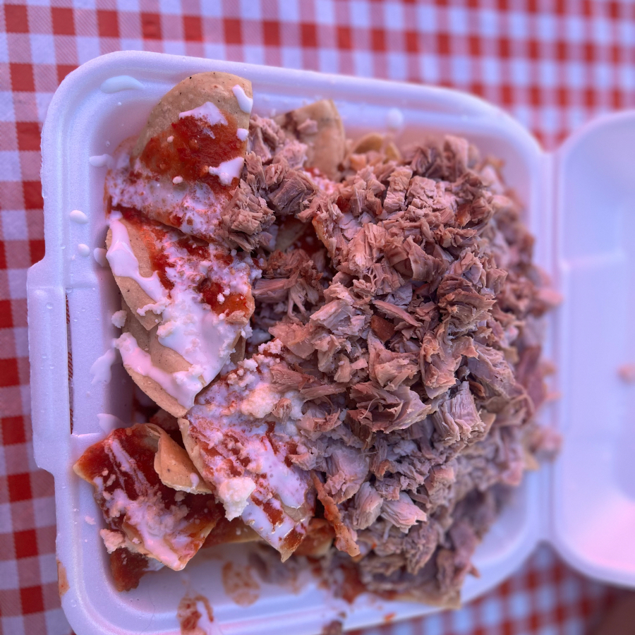 Chilaquiles con salsa roja picante con carnitas