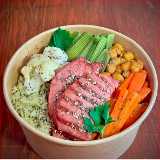 Bowl de arroz cocido, carne de res a la plancha, brócoli, zanahoria, elotes, coliflor y aderezo, puedes elegir cambiar el arroz banco: amarillo de azafrán y cúrcuma o verde de cilantro y espinacas.