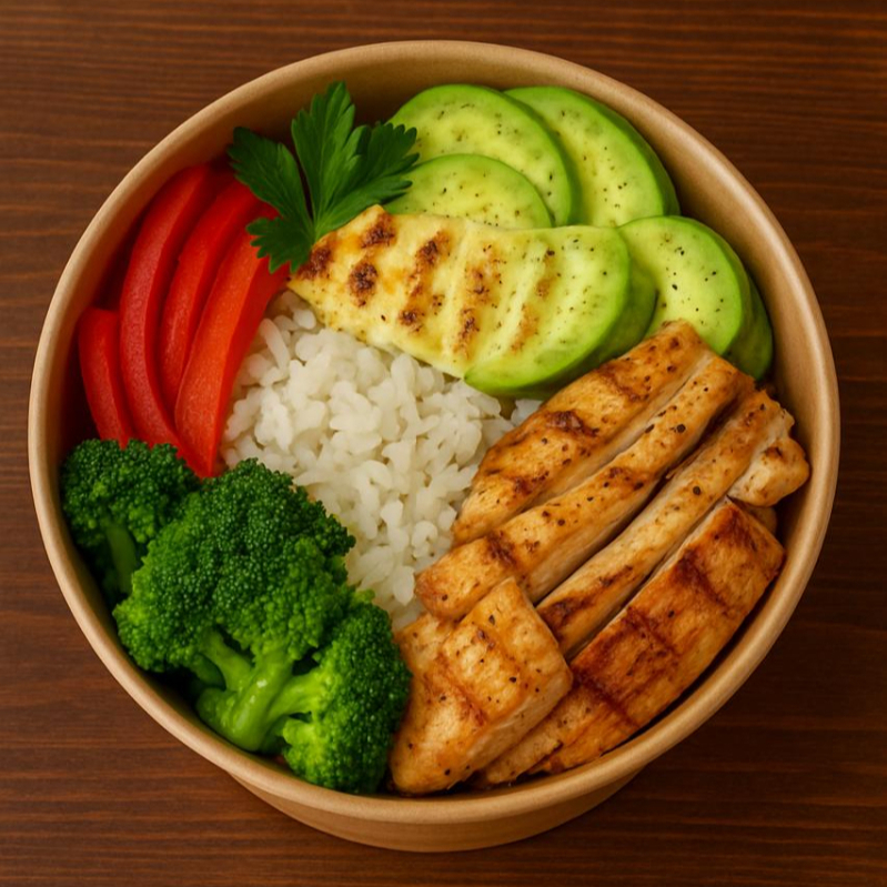 Bowl de arroz cocido, pollo a la plancha, brócoli, zanahoria, elotes, coliflor y aderezo, puedes elegir cambiar el arroz banco: amarillo de azafrán y cúrcuma o verde de cilantro y espinacas.