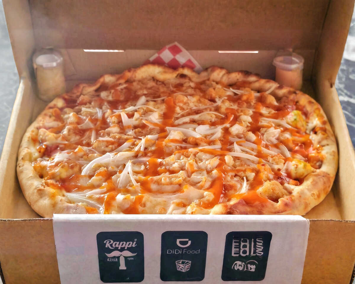Pizza grande (14 pulgadas y 8 rebanadas) Salsa de jitomate, Queso, Pechuga de Pollo, Cebolla & Salsa Habanera