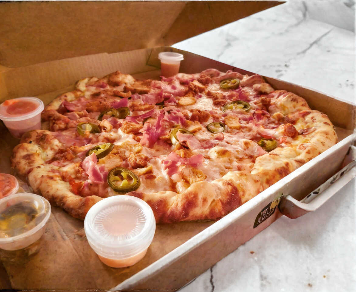 Salsa de jitoamte, queso, pepperoni, piña & tocino