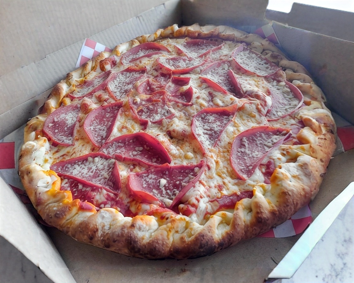 Salsa tomate, pepperoni, tocino, champión, cebolla y mozzarella