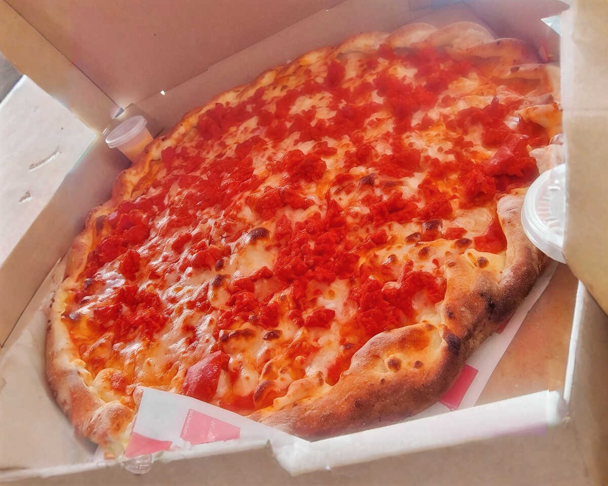 Salsa de jitomate, queso & chorizo (Pizza grande de 14 pulgadas y 8 rebanadas), salsa chimichurri de 1 onza cada una, esta pizza máximo para 3 personas