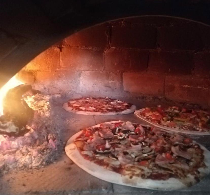 Salsa tomate, pepperoni, tocino, pimiento, aceituna, cebolla y mozzarella