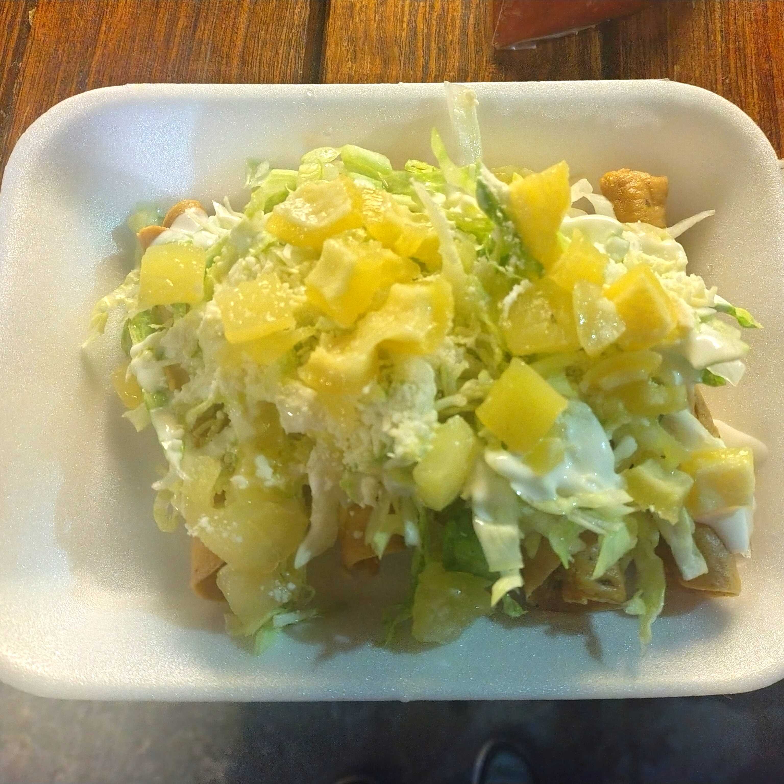 Exquisitas flautas rellenas de carne deshebrada, coronado, lechuga, crema y queso.