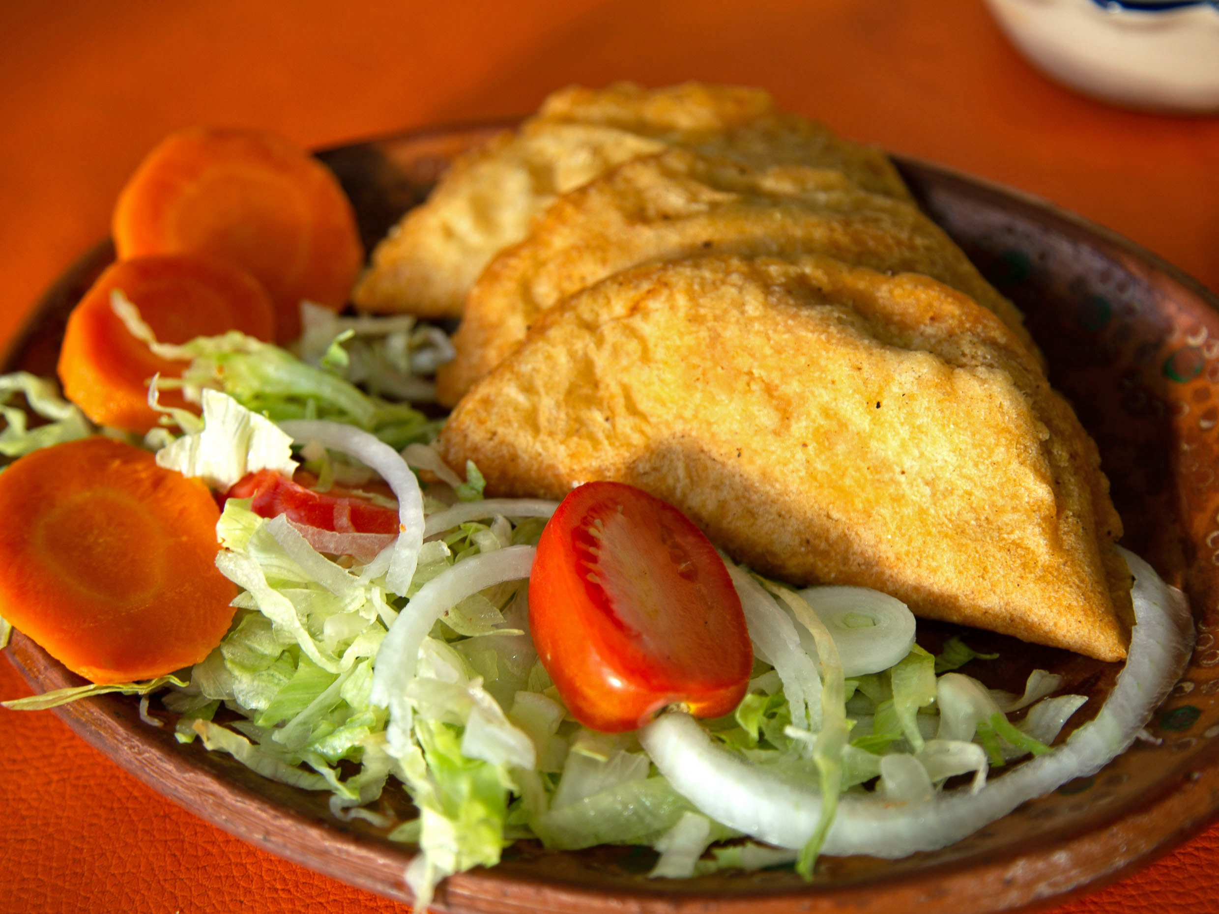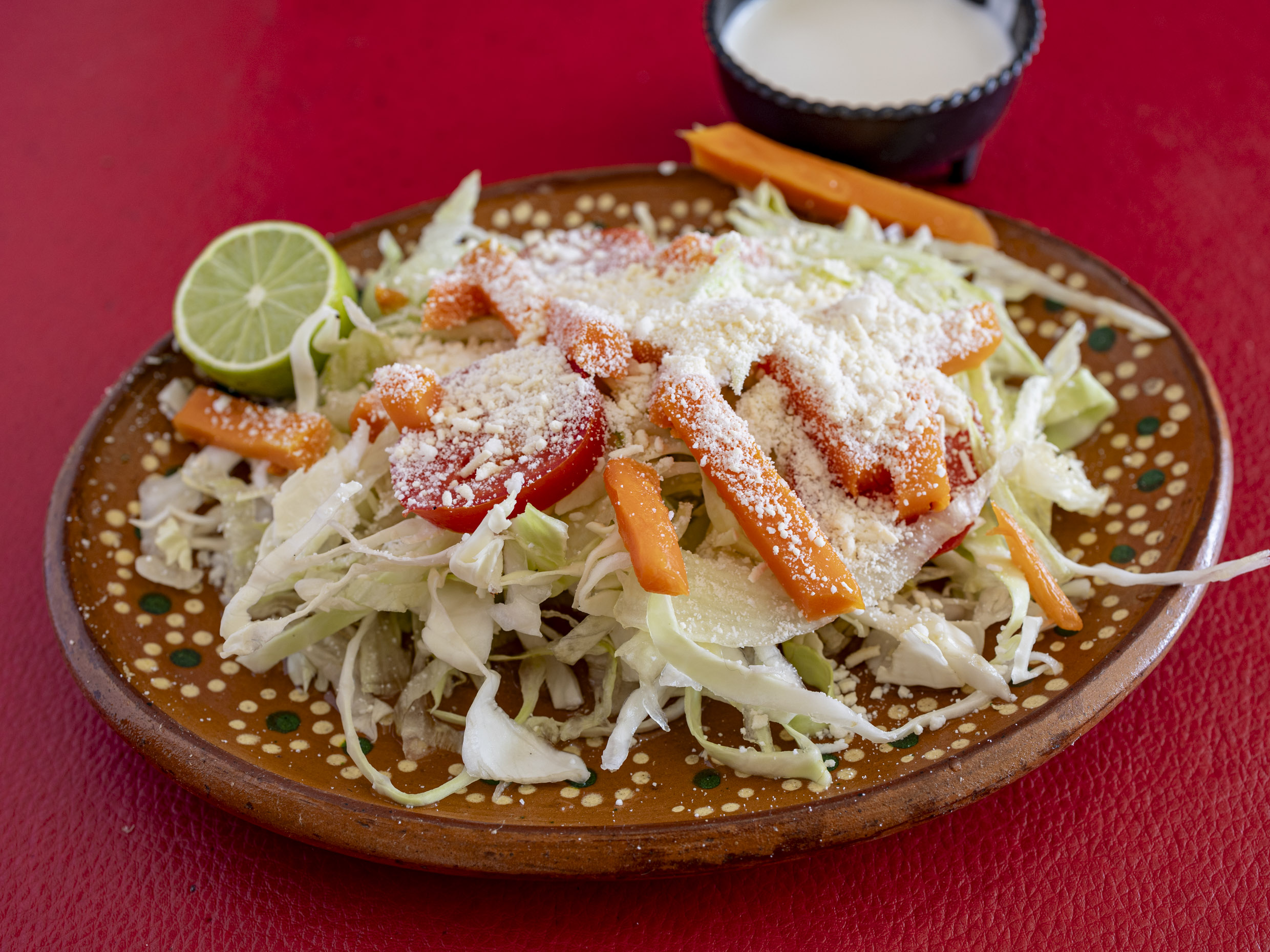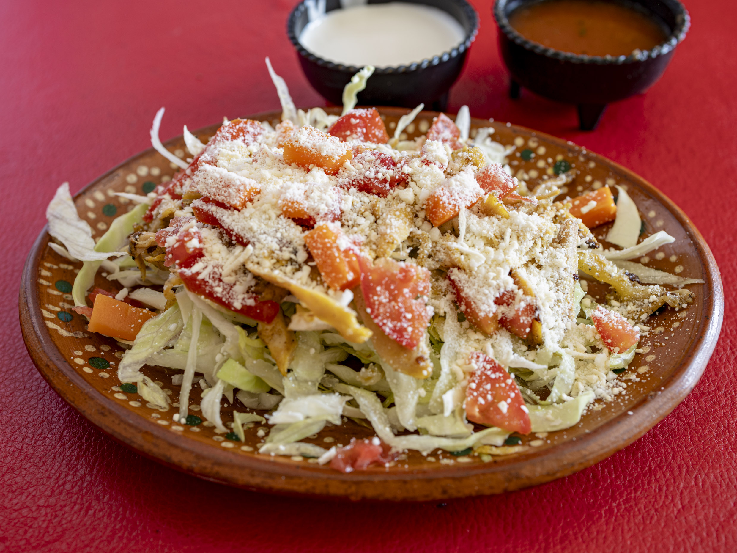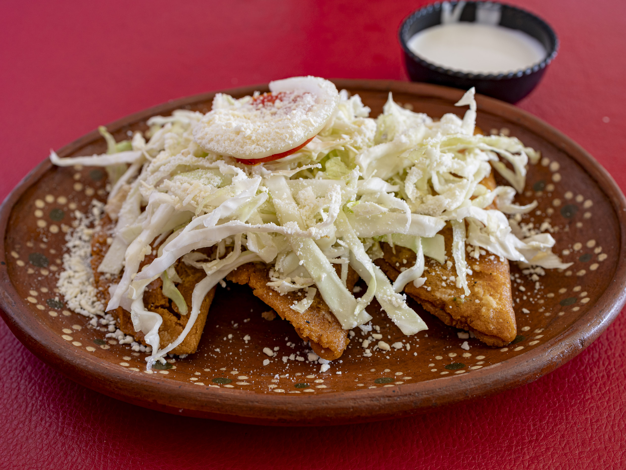 3 quesadillas fritas, lechuga, jitomate, cebolla, guacamole, crema y queso.