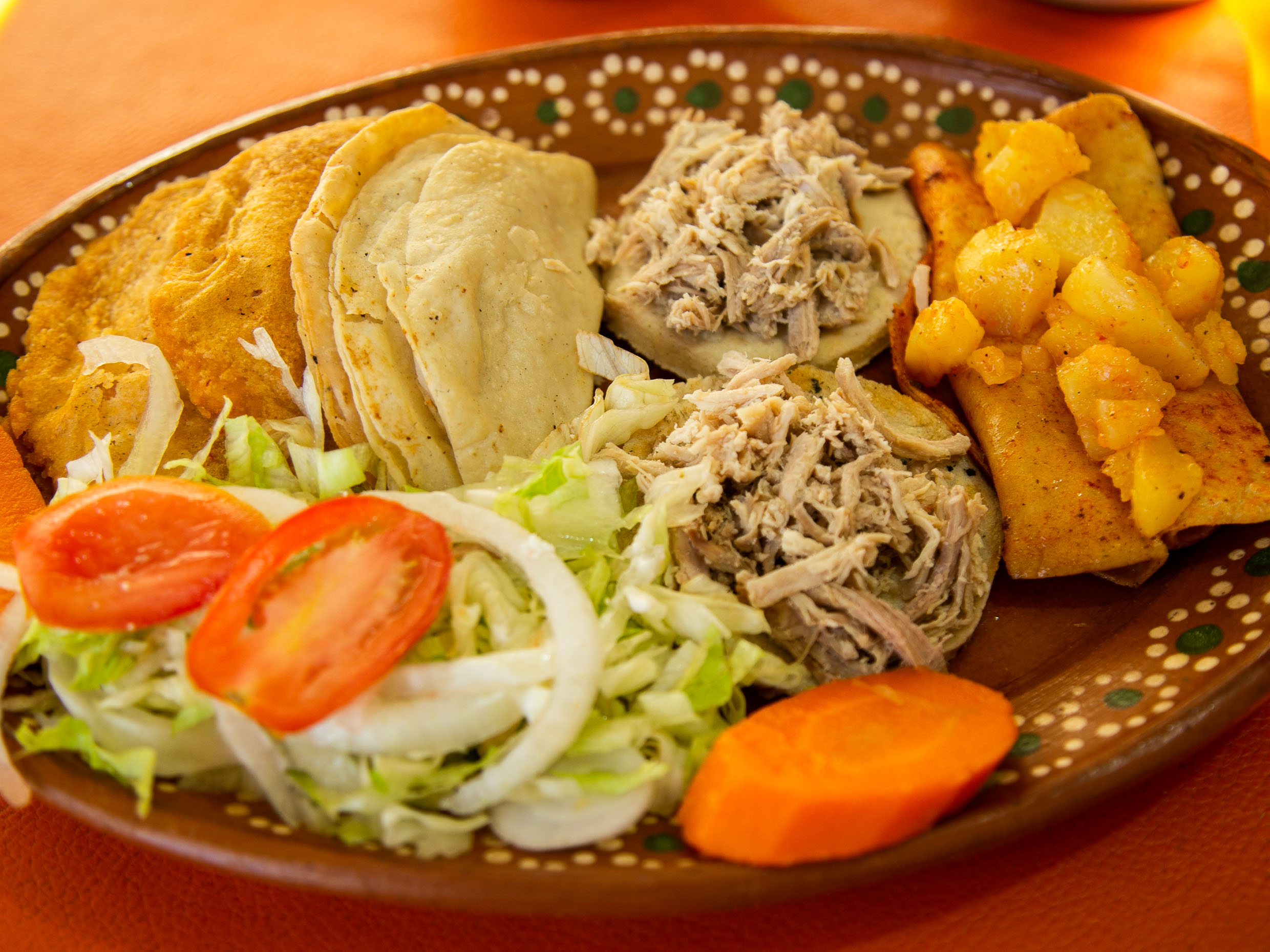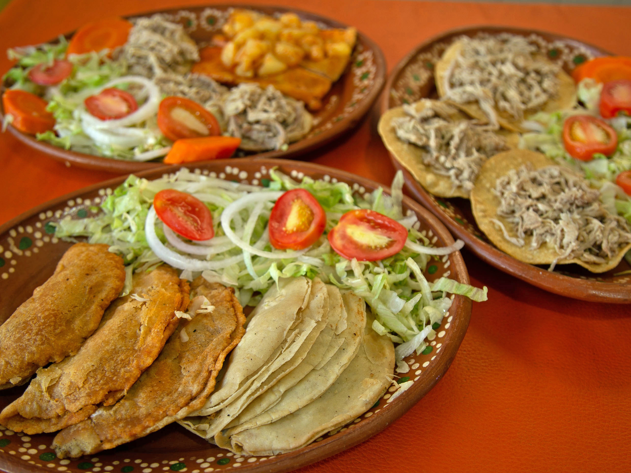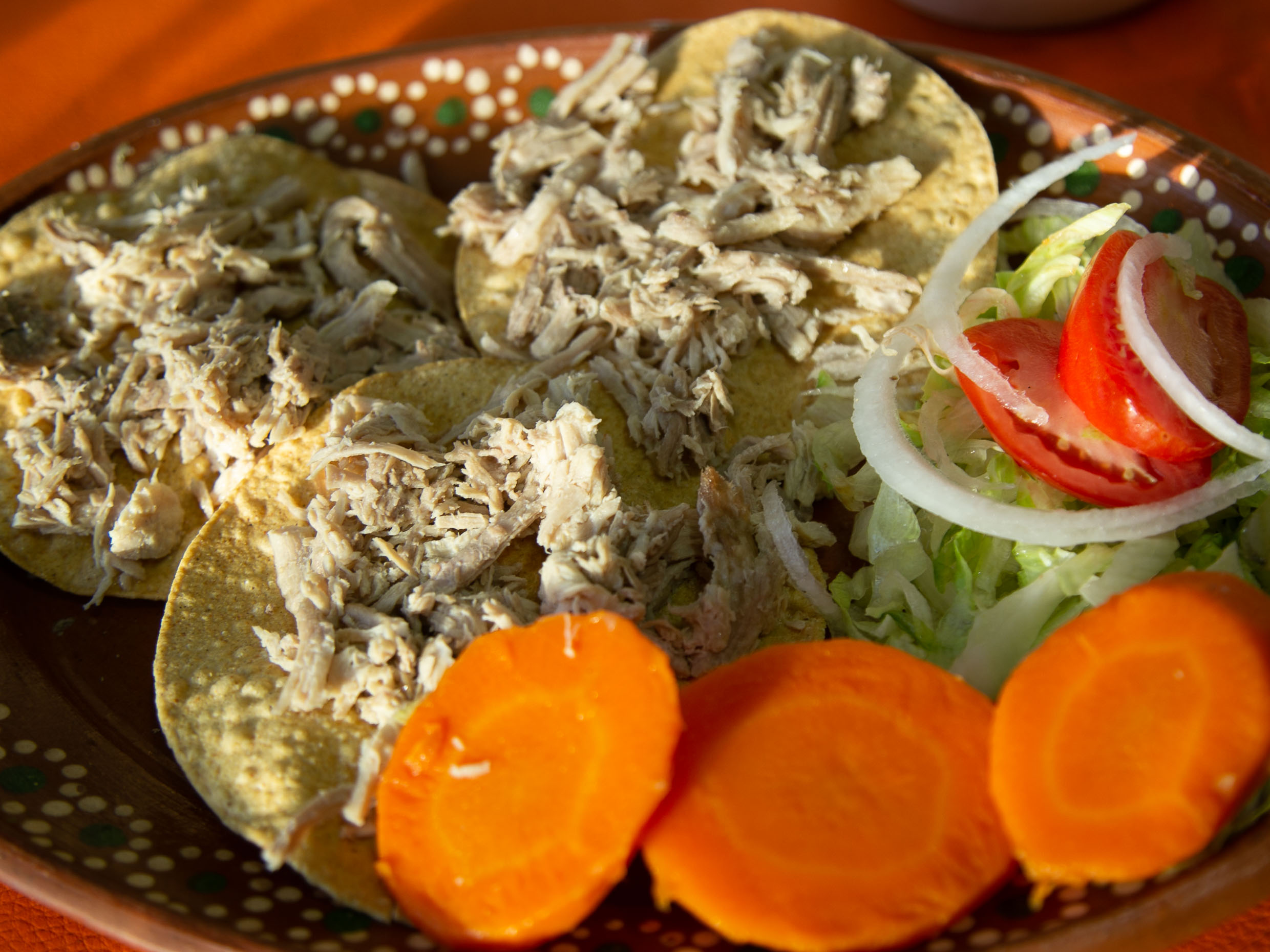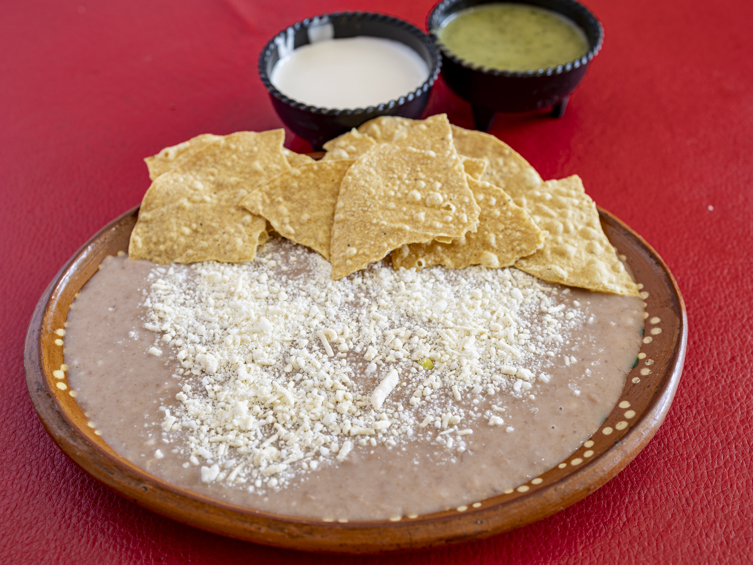 3 quesadillas fritas, lechuga, jitomate, cebolla, guacamole, crema y queso.