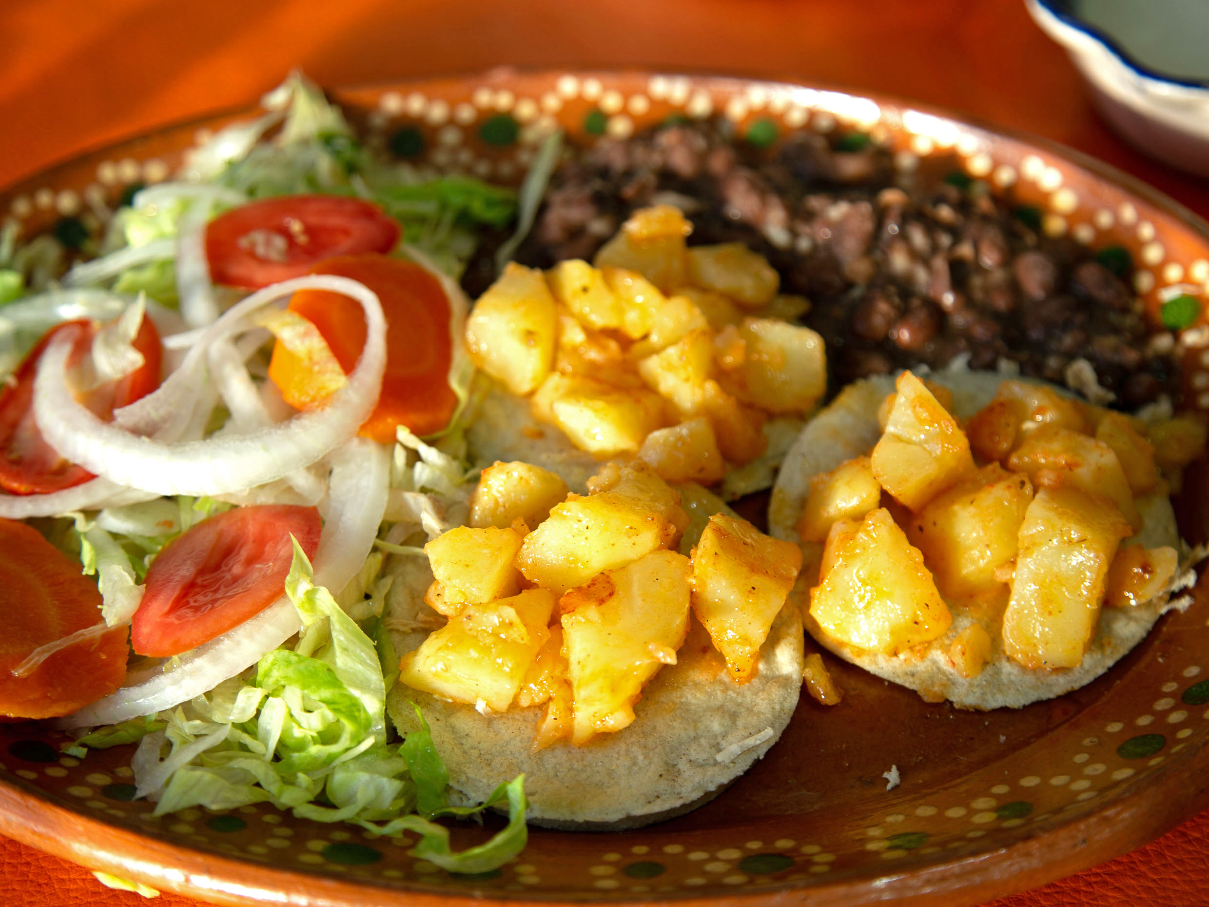 3 sopes, frijoles, carne o papas, lechuga, jitomate, cebolla, guacamole, crema y queso.