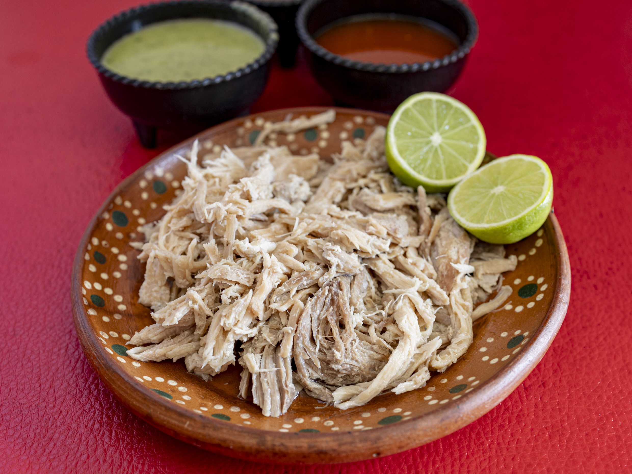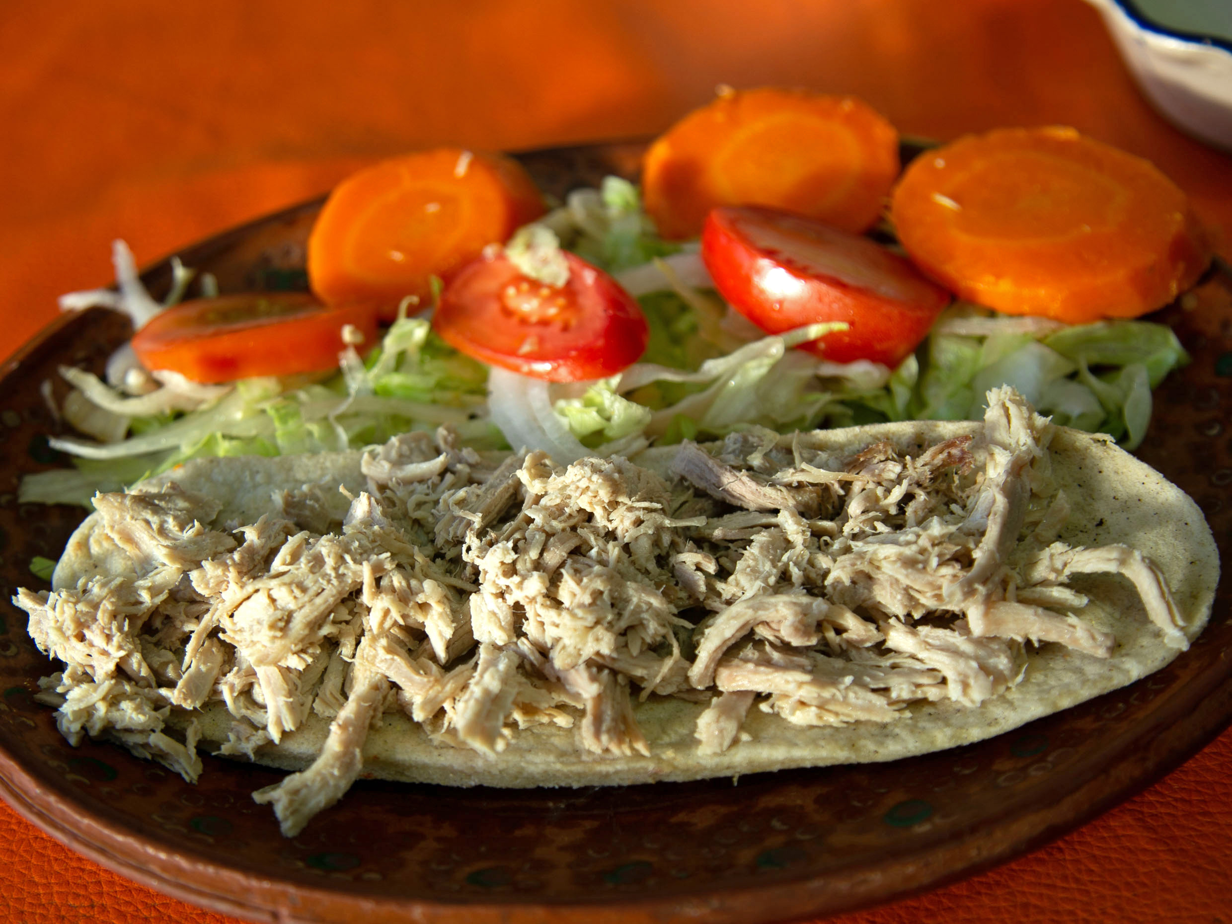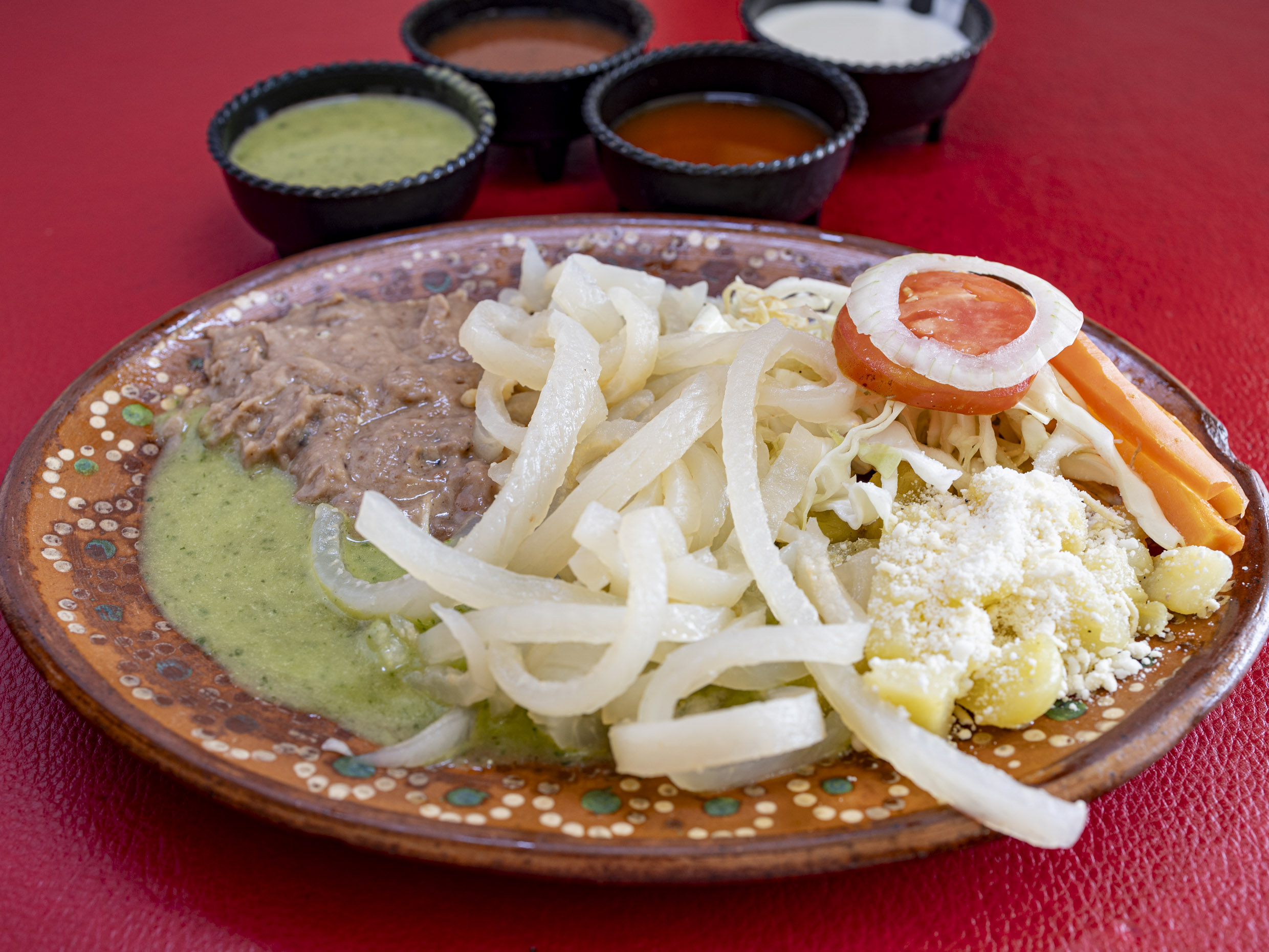 1 huarache de carne deshebrada, lechuga, jitomate, cebolla, guacamole, crema y queso.