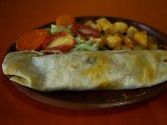 Burro gigante, frijoles, carne deshebrada, papas, lechuga, jitomate, cebolla, crema y queso.
