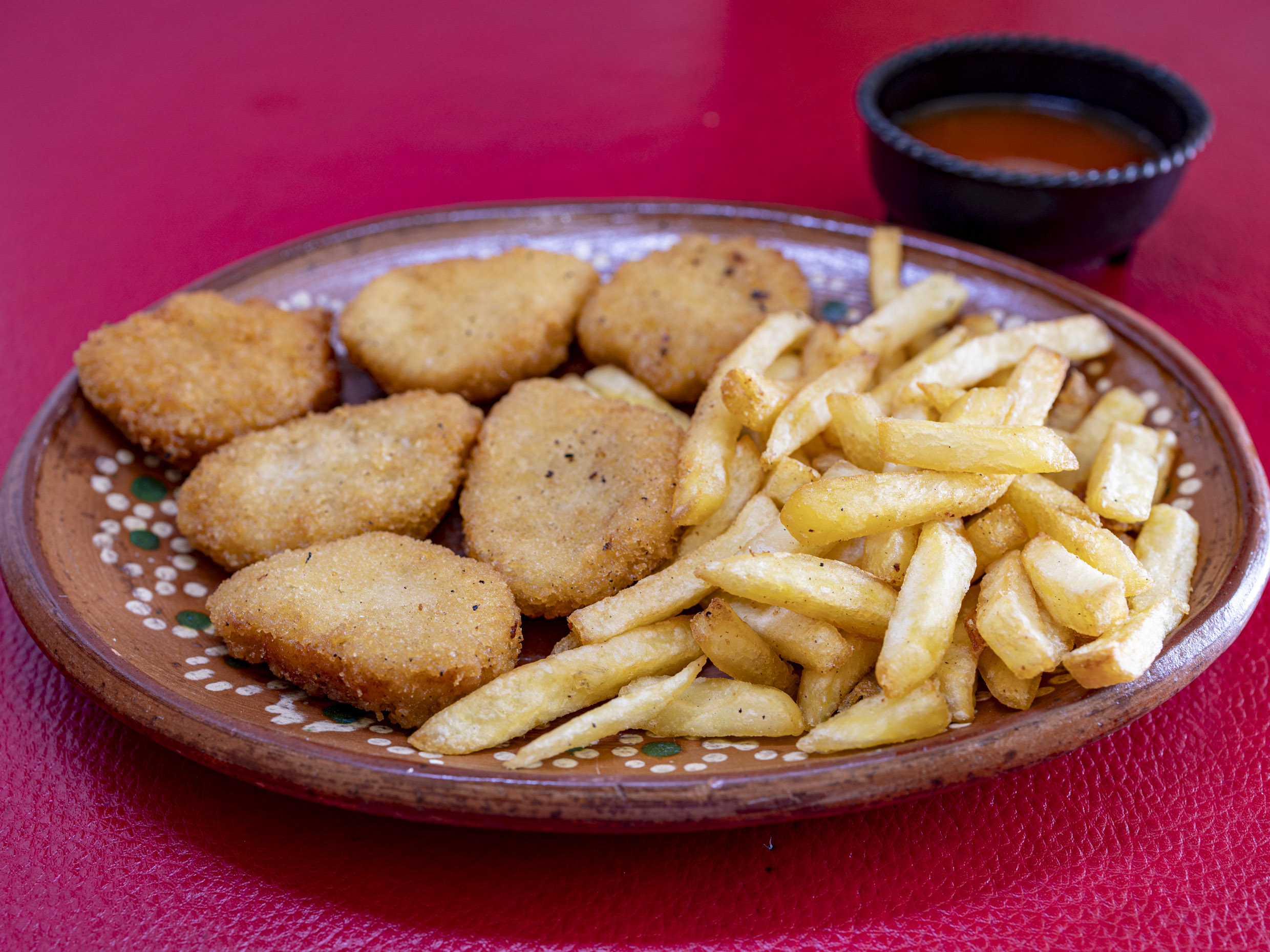 1 pieza de pollo frito, lechuga, jitomate, cebolla, papas, guacamole y frijoles.