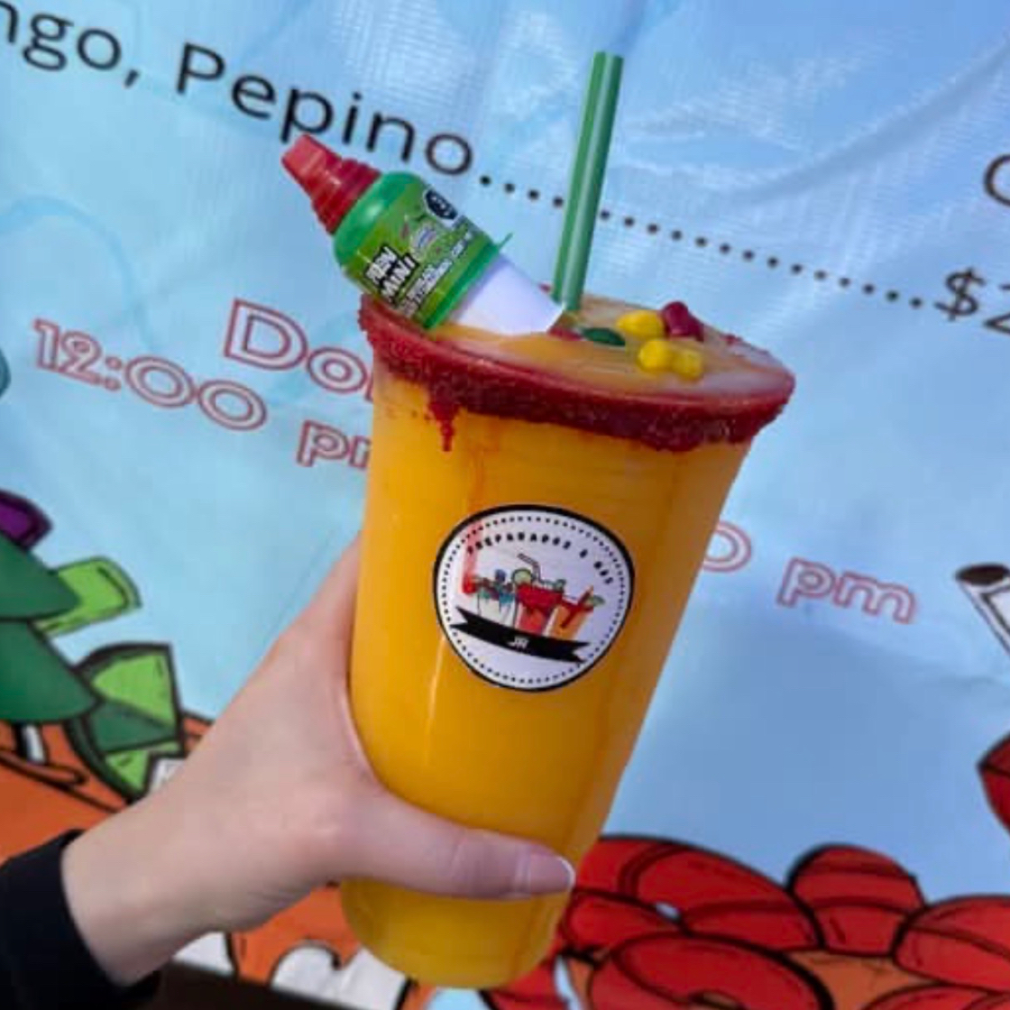 Mango natural, endulzante natural, agua mineral y chamoy acompañado de gomitas