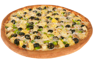 Champiñones, piña, pimiento verde, aceitunas y extra queso.