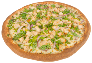 Pollo asado, salsa BBQ, cebolla morada, pimiento verde, cilantro y extra queso.