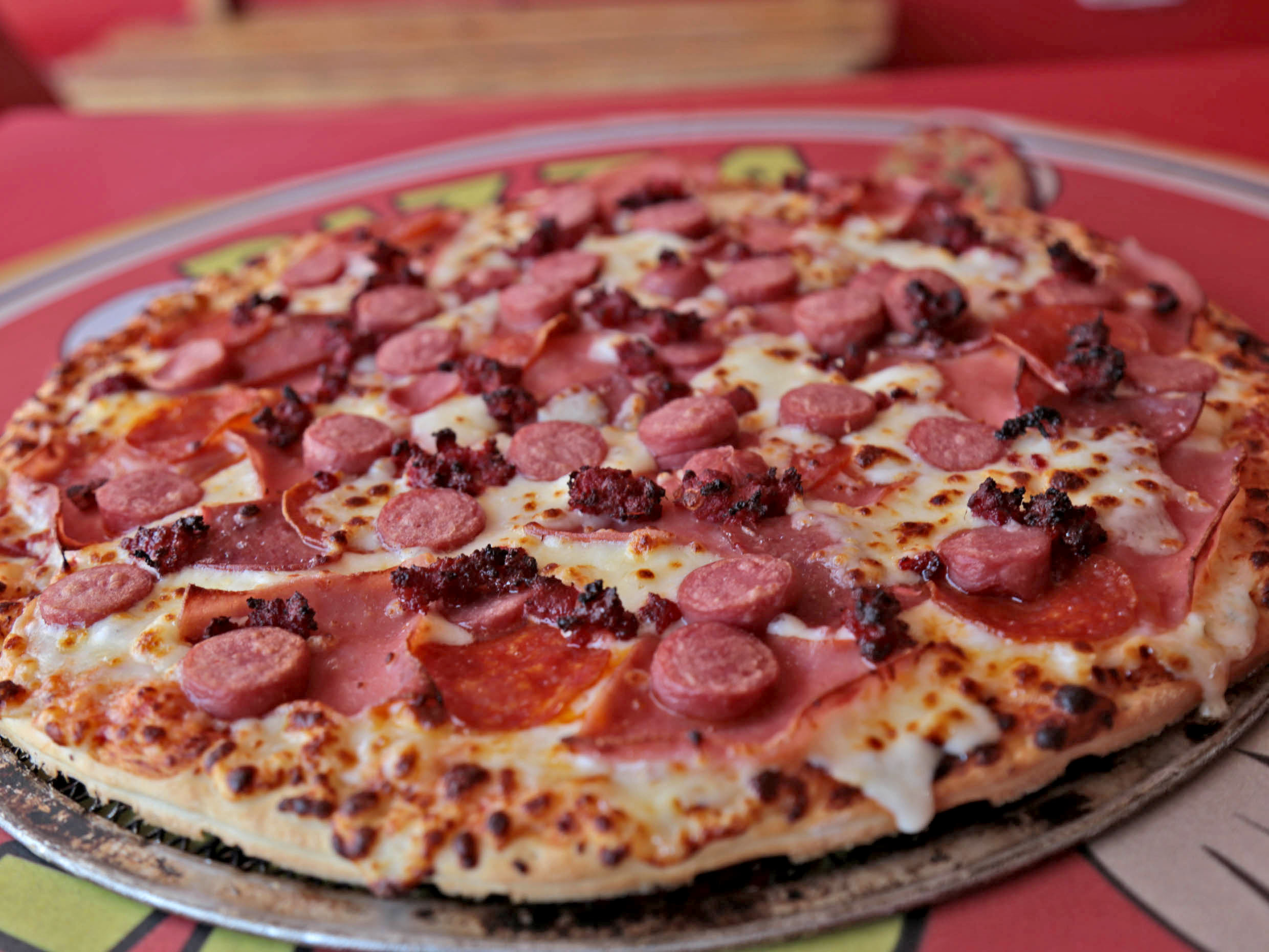Jamón, salami, pimiento verde, champiñones, cebolla y chorizo.