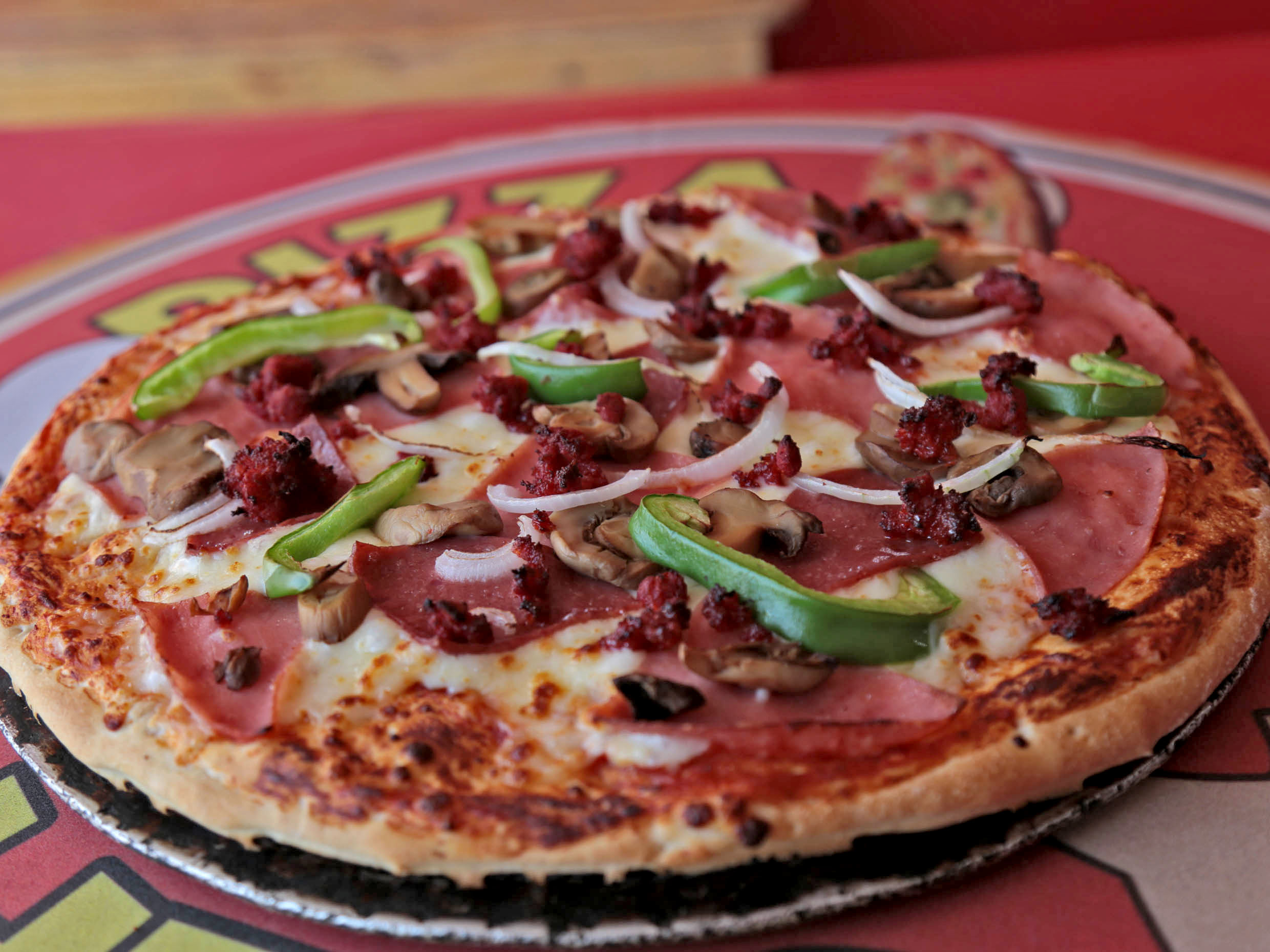 Pepperoni, pimiento verde, cebolla, aceitunas, champiñones y salchicha.