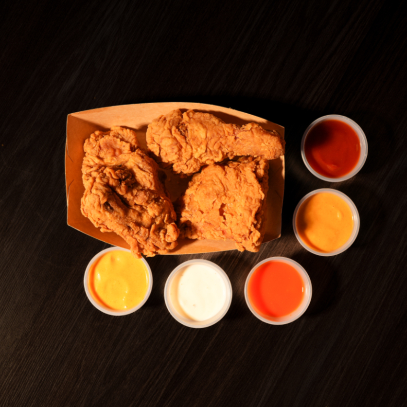3 Muslos, 3 piernas, 2 brisquets, 2 purés de papa individual o 2 ensalada individual.
