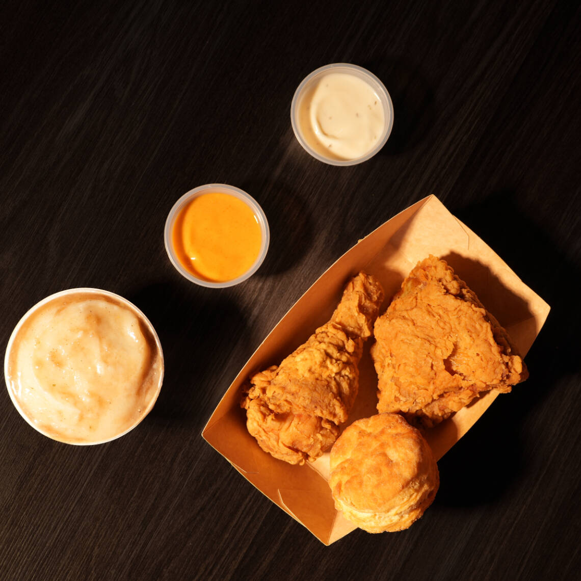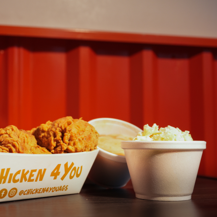 2 Muslos, 1 pierna, 1 brisquet, 1 pure de papa individual o ensalada individual.