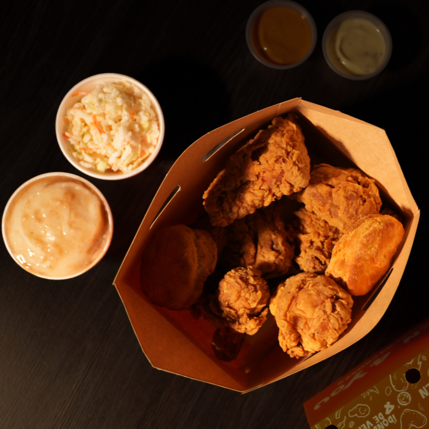 5 Muslos, 5 piernas, 2 bisqueTs, 2 purés de papa grande o ensalada grande.