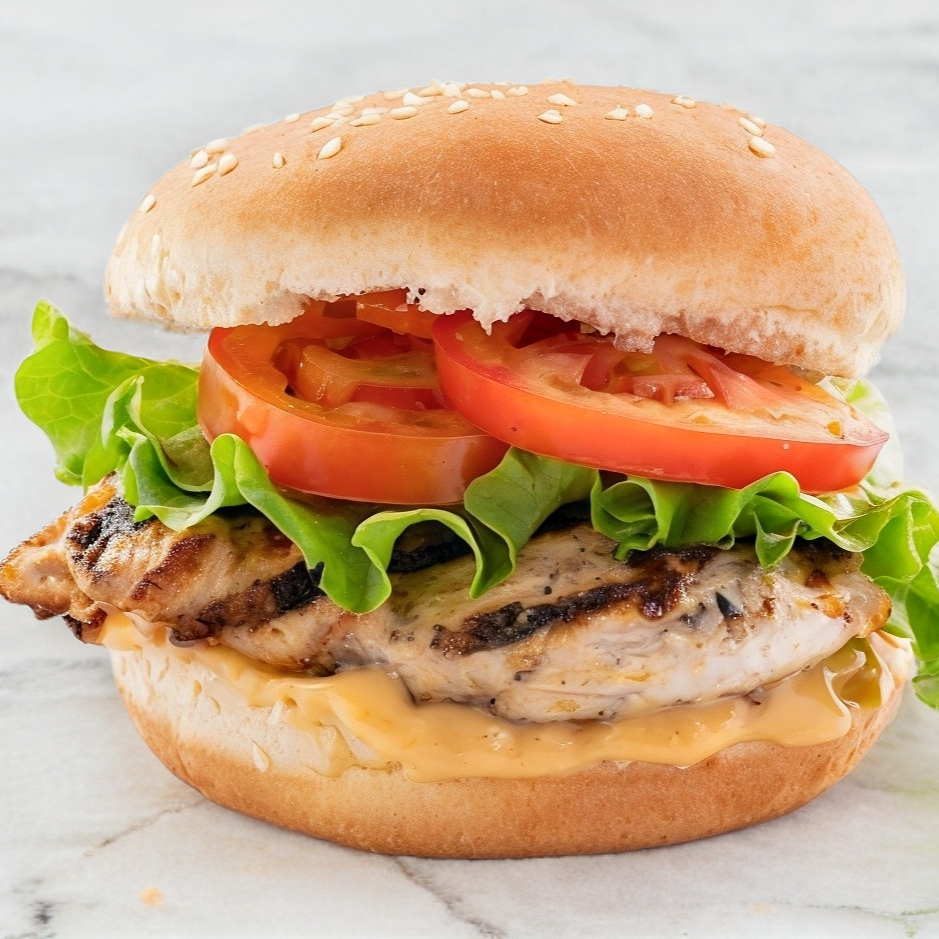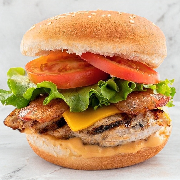 Pechuga a la plancha, queso, tocino, lechuga, jitomate y pepinillos.