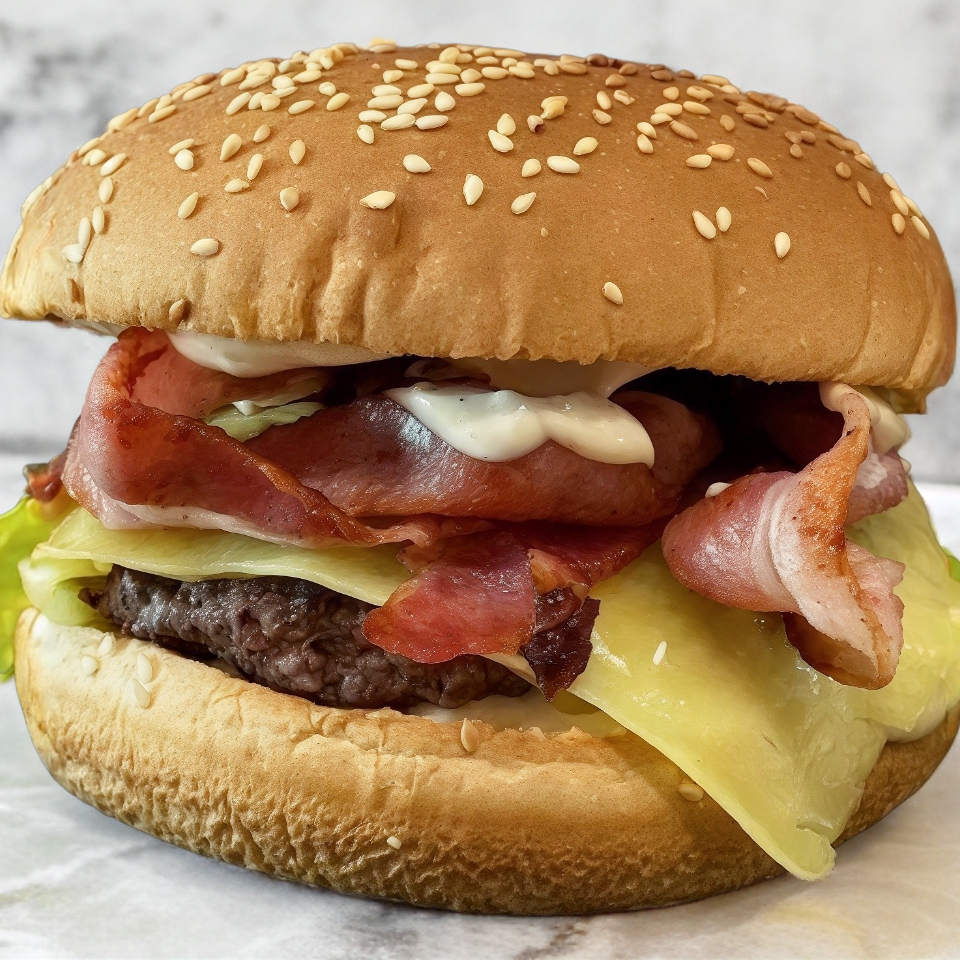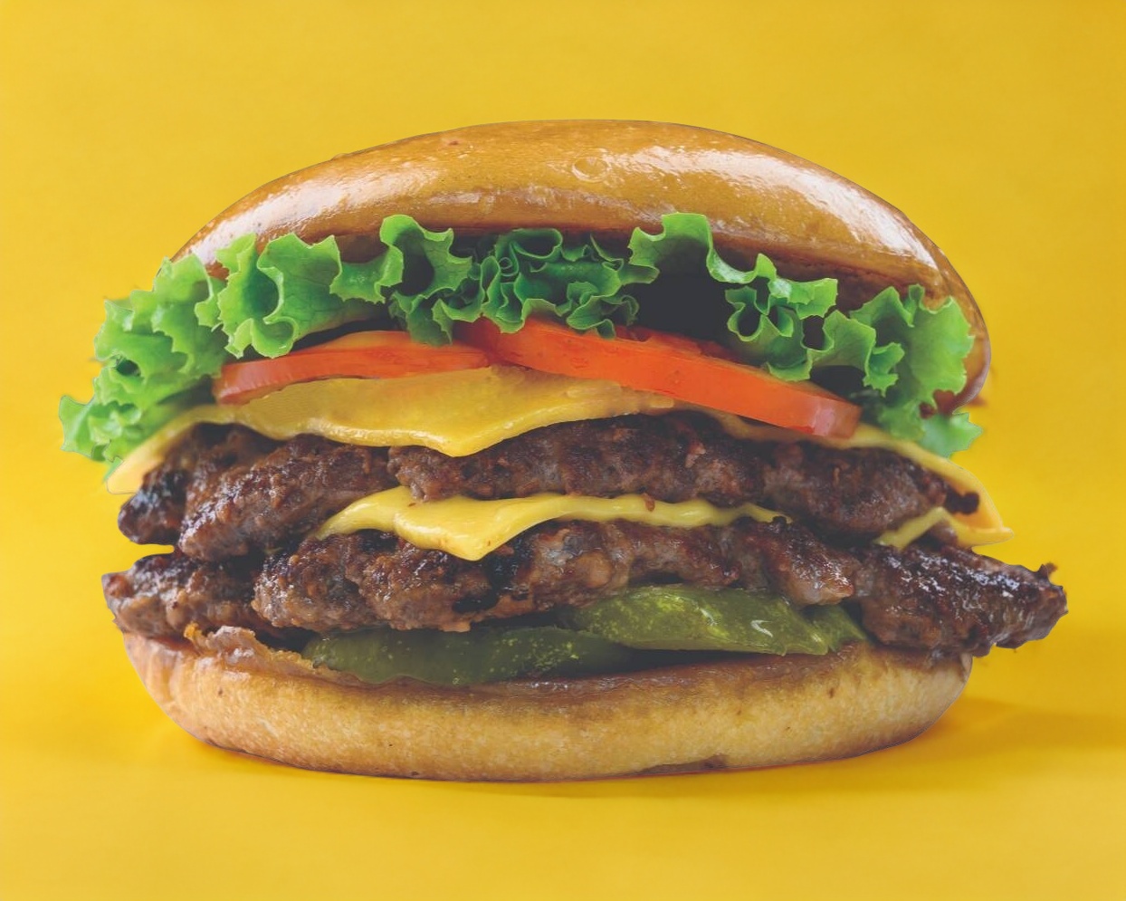 Hamburguesa doble de res con doble queso americano, jitomate, pepinillos y lechuga.