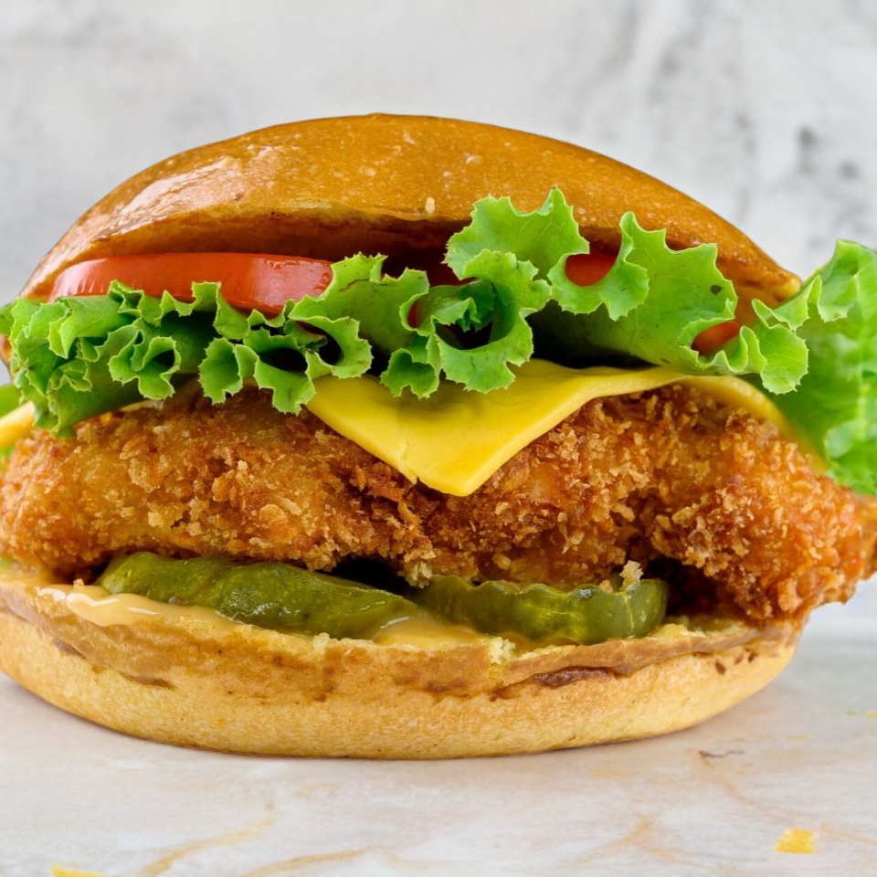 Hamburguesa de pechuga empanizada, pepinillos, salsa de la casa de chipotle y miel, queso americano.