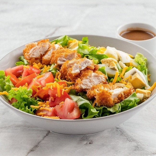 Ensalada con lechuga, jitomate, pechuga empanizada, huevo cocido, queso gouda y tocino picado. Incluye aderezo a elegir.