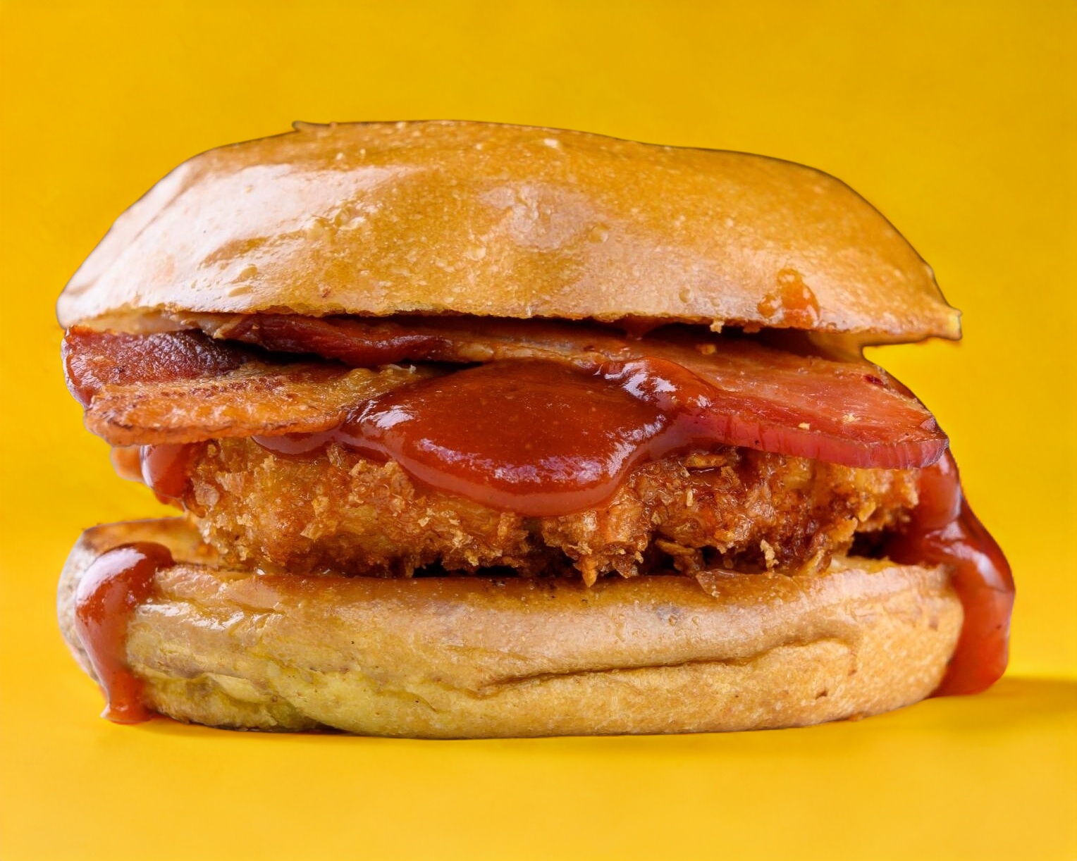 Pechuga Crispy, salsa BBQ, queso, tocino, pepinillos
