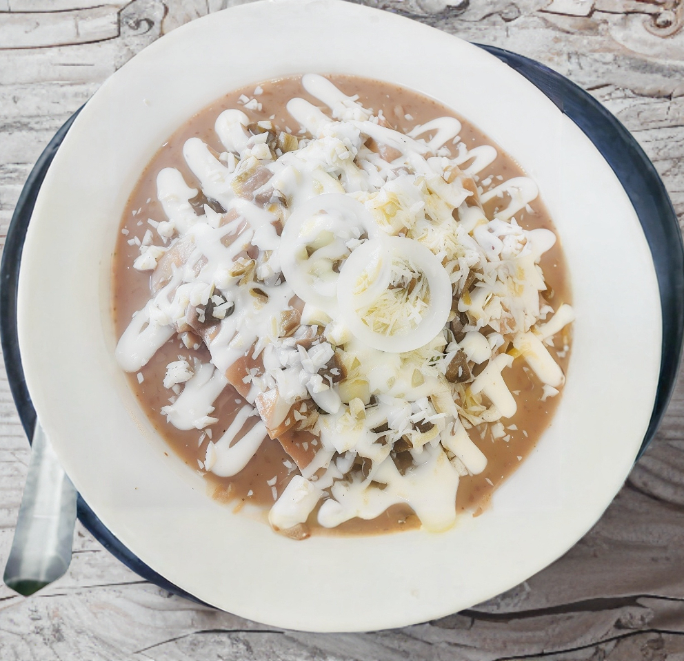 Acompañados con frijoles, crema, queso y cebolla (el complemento es extra )