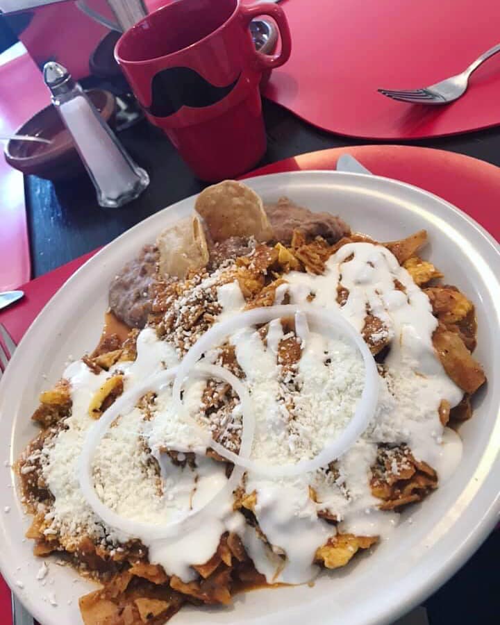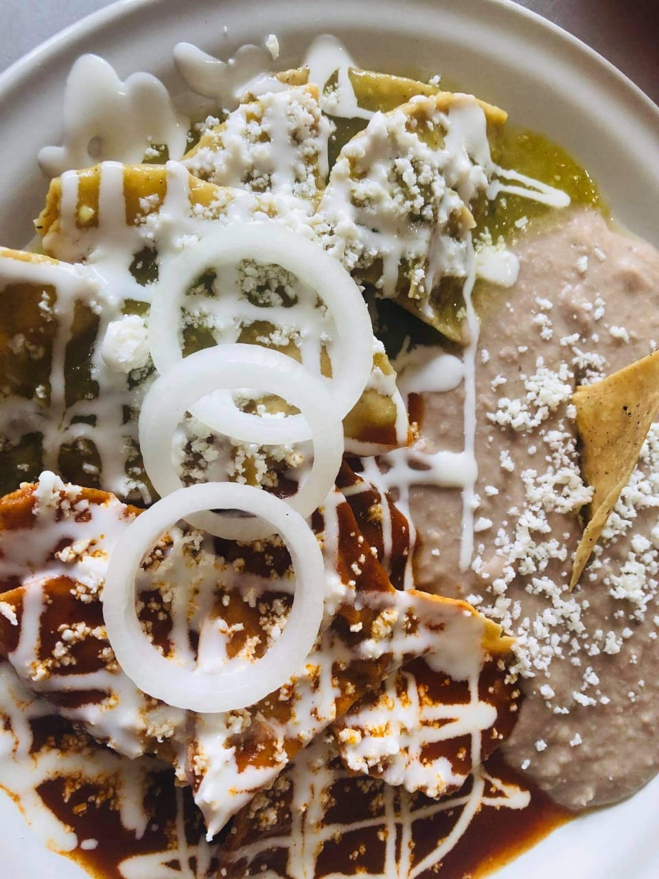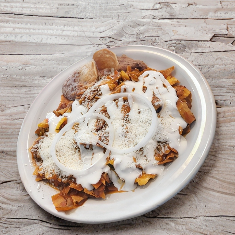 Acompañados con frijoles, crema, queso y cebolla ( llevan Huevo revuelto entre los totopos y la salsa )