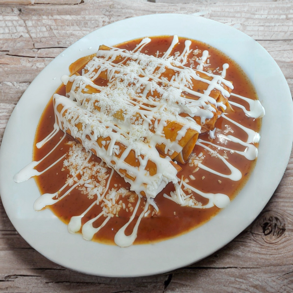 4 pz. De enmoladas con queso (rellenas de queso y bañadas de mole acompañadas de crema, queso, cebolla y ajonjolí )