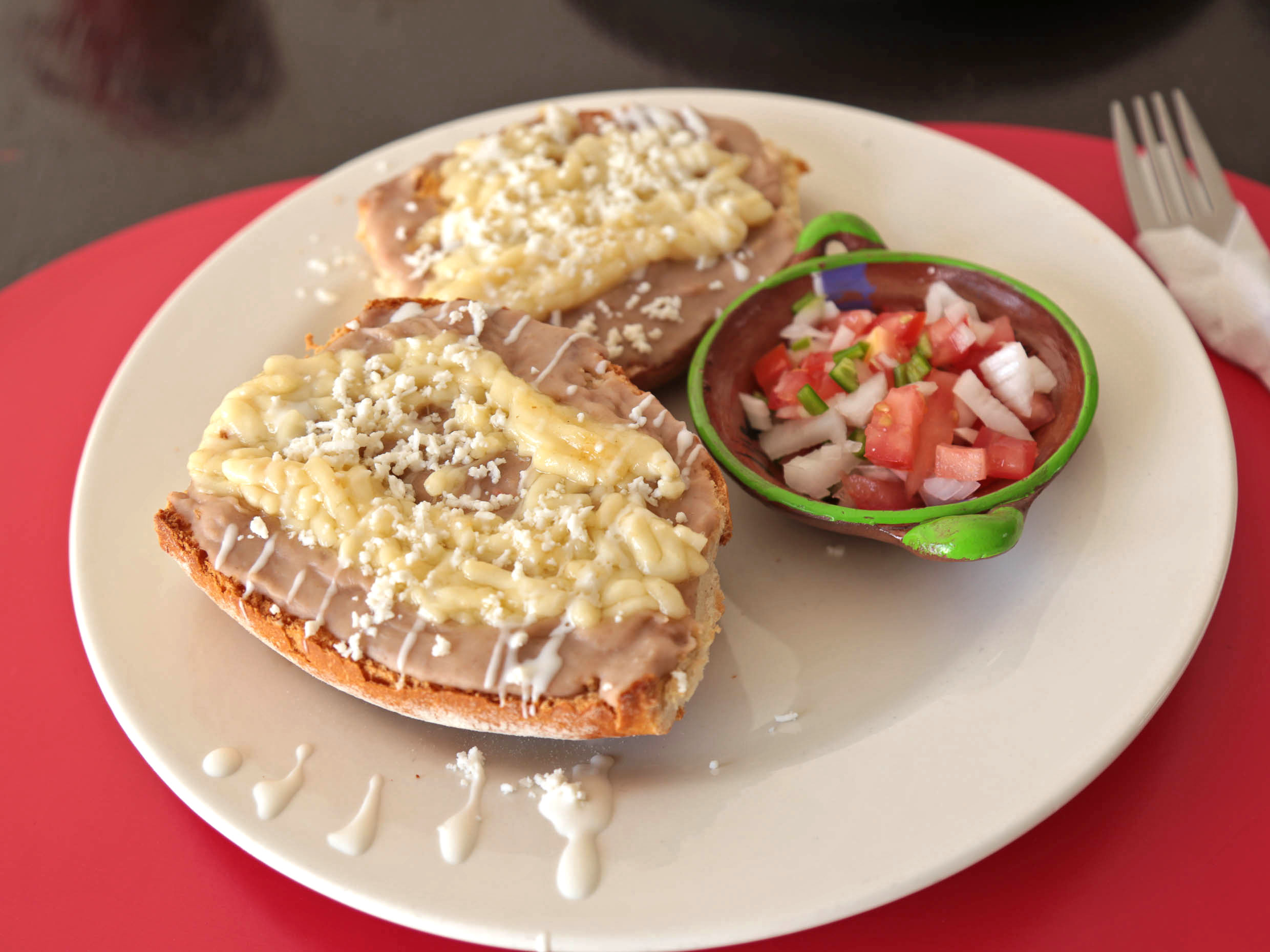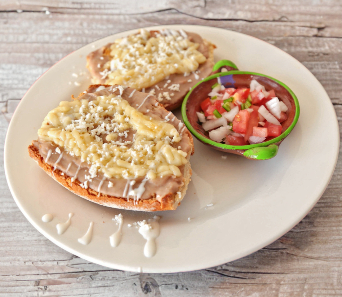 2 pz. ( 1 bolillo partido a la mitad ) con frijoles, queso gratinado, queso fresco y pico de gallo, crujientes