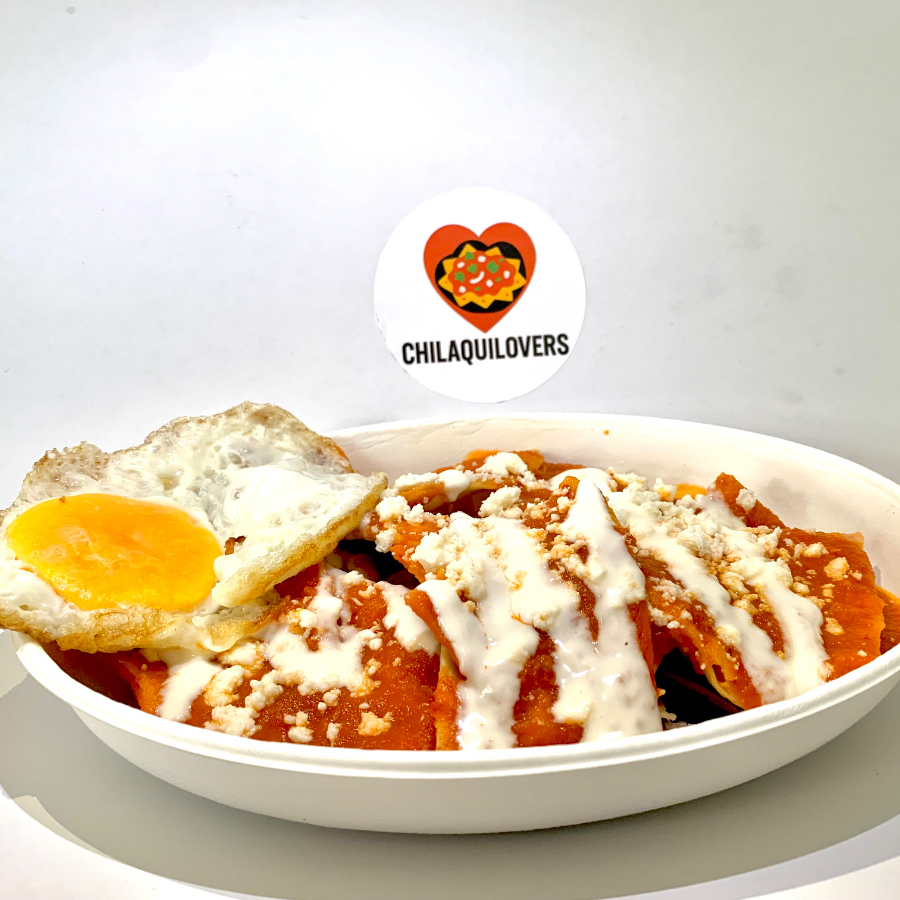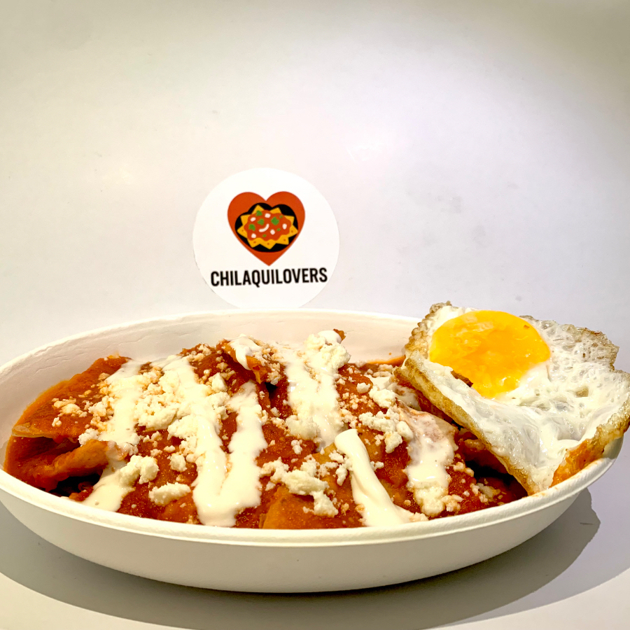 Chilaquiles en salsa roja (ligeramente picante), incluyen cebolla morada, crema, queso fresco y porción de frijoles