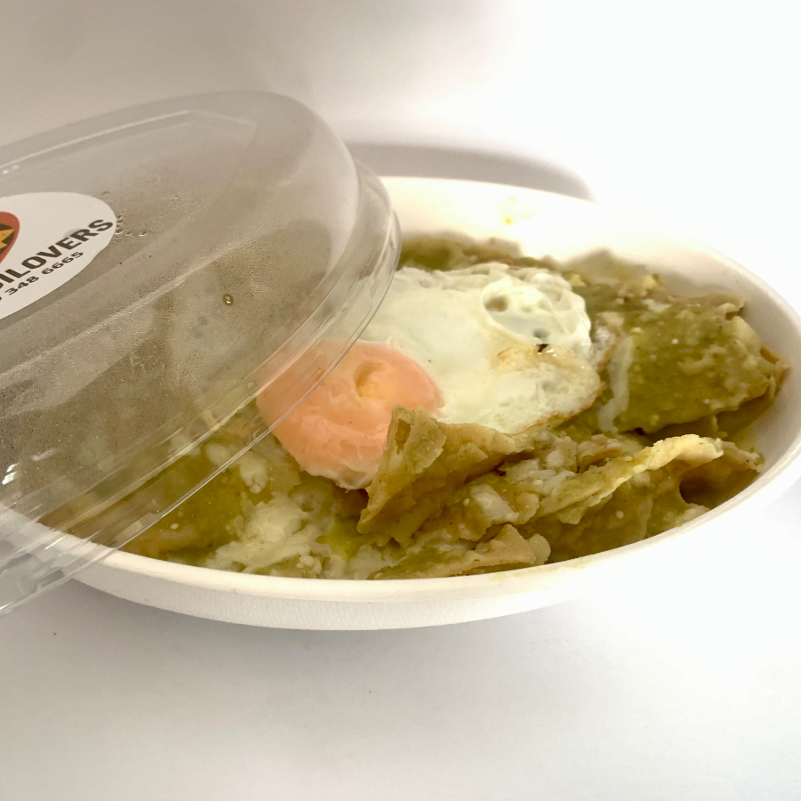 Chilaquiles en salsa verde (picante), incluyen cebolla morada, crema, queso fresco y porción de frijoles