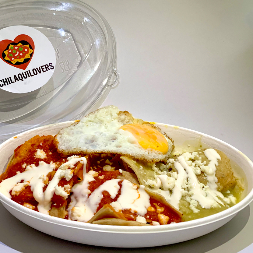 Chilaquiles con 2 salsas a elegir, incluyen cebolla morada, crema, queso fresco y porción de frijoles