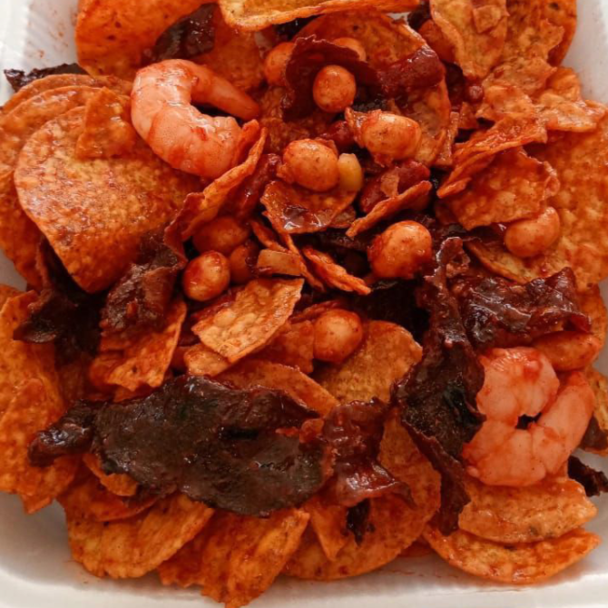 Papas a elegir, cacahuate, pepino, rielito, salsas, camarón, carne seca y shot de Clamato.