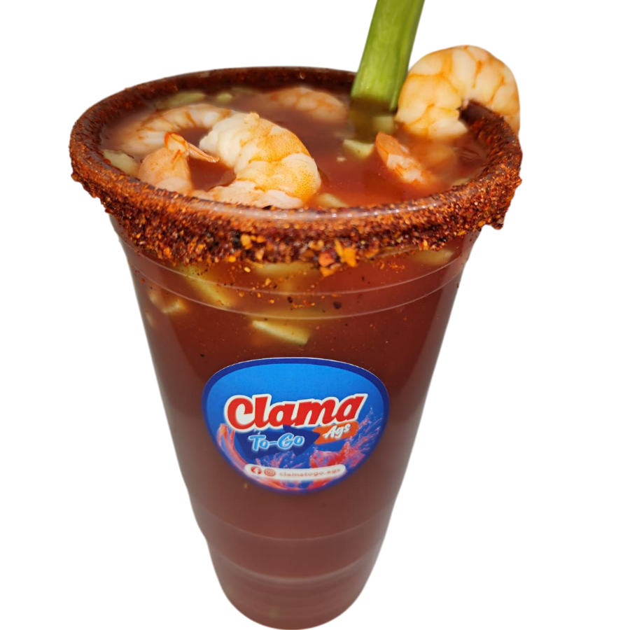 Clamato preparado, apio, pepino y camarón.