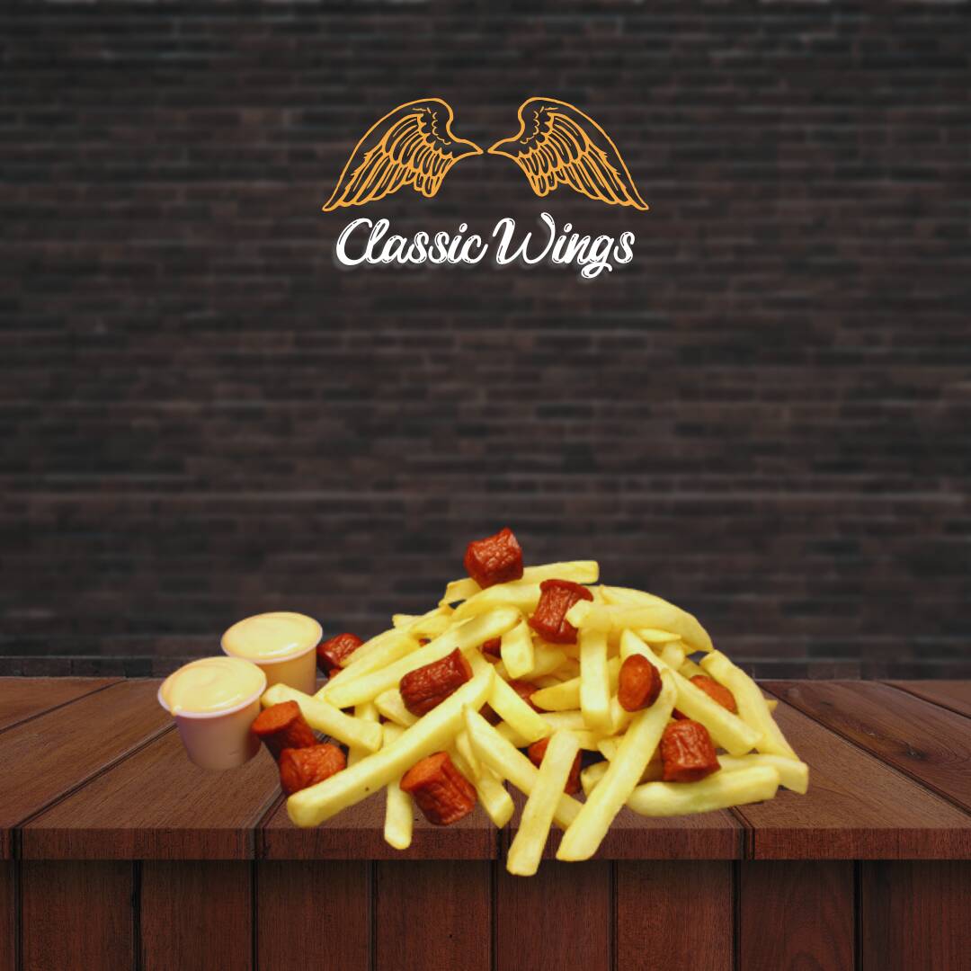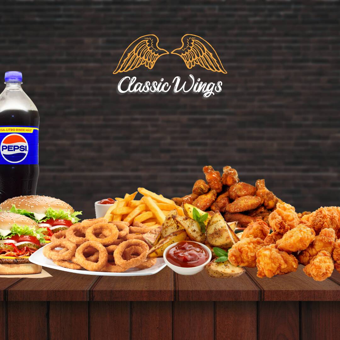 10 Alitas, 10 boneless, 2 classic burguer, 150 g de gajo, 150 g de francesa, aros, refresco.