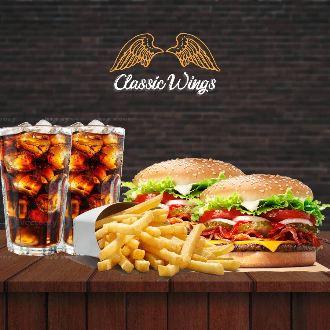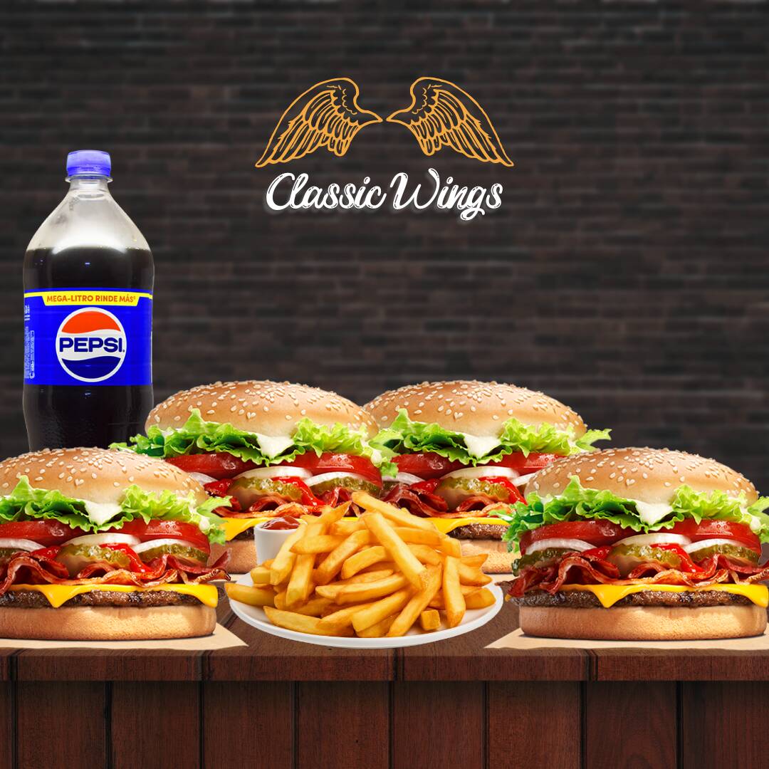 2 Classic burguer, 200 g de papas, 2 refrescos.