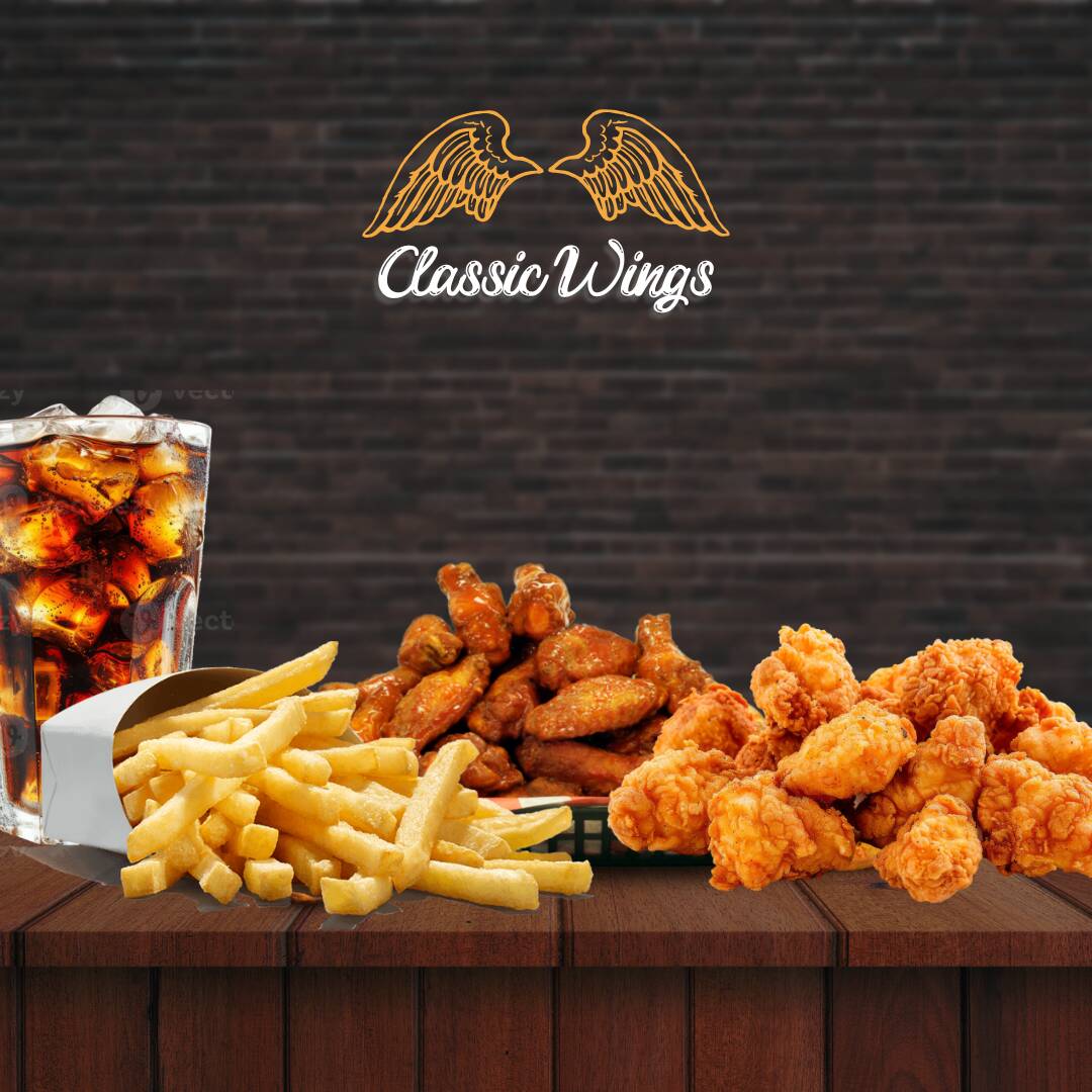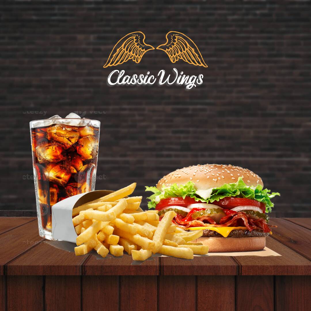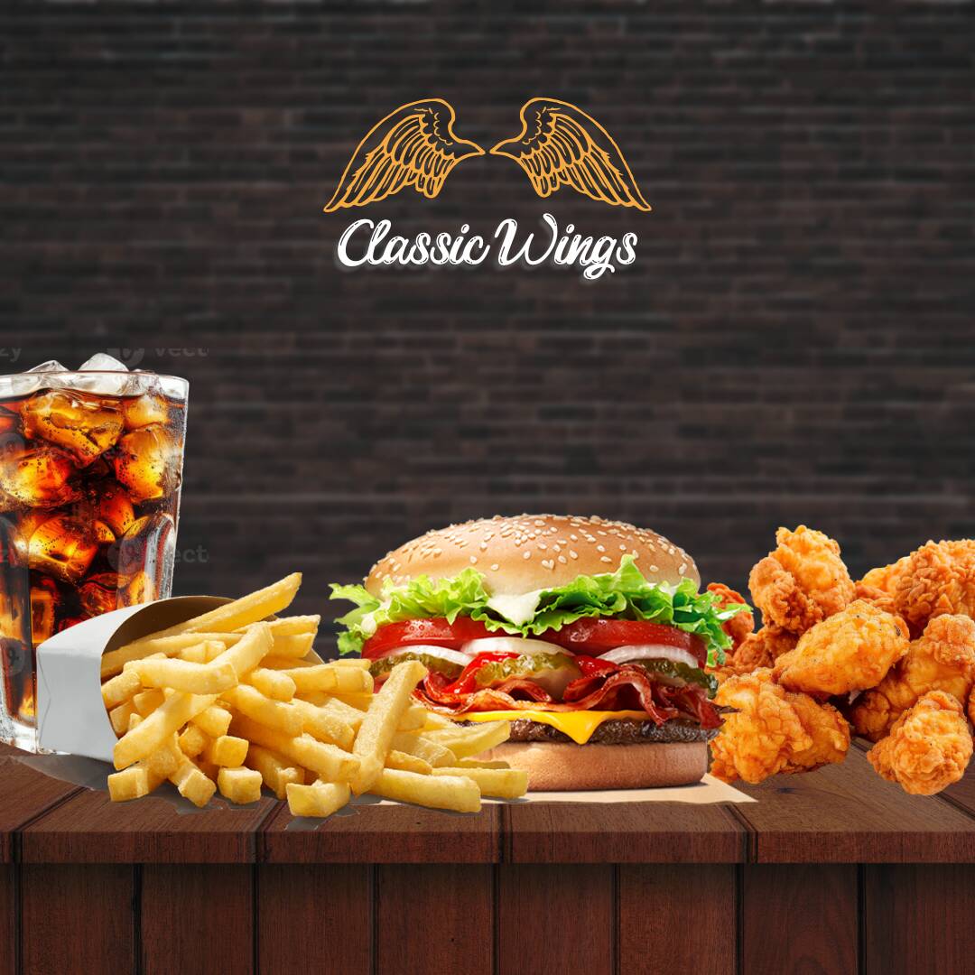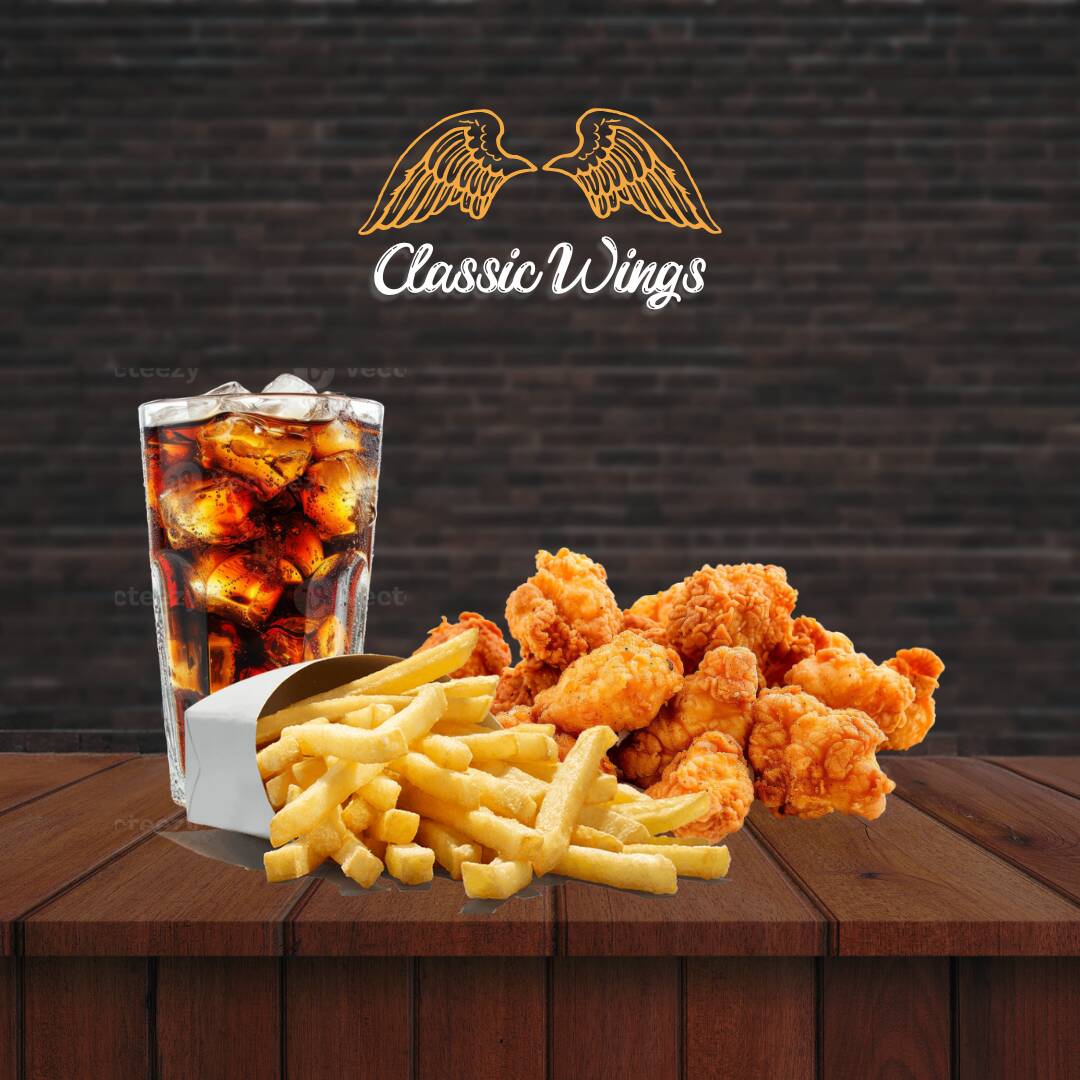 6 Alitas o 6 boneless, 150 g de papas, classic burguer, refresco.