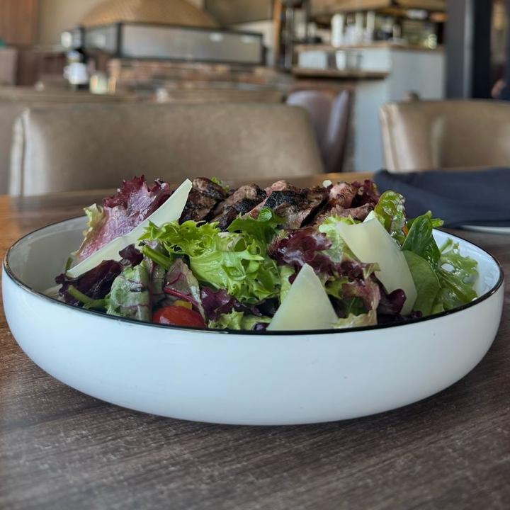 Clásica ensalada césar con pollo a la plancha, pasta italiana, crutones y parmesano.