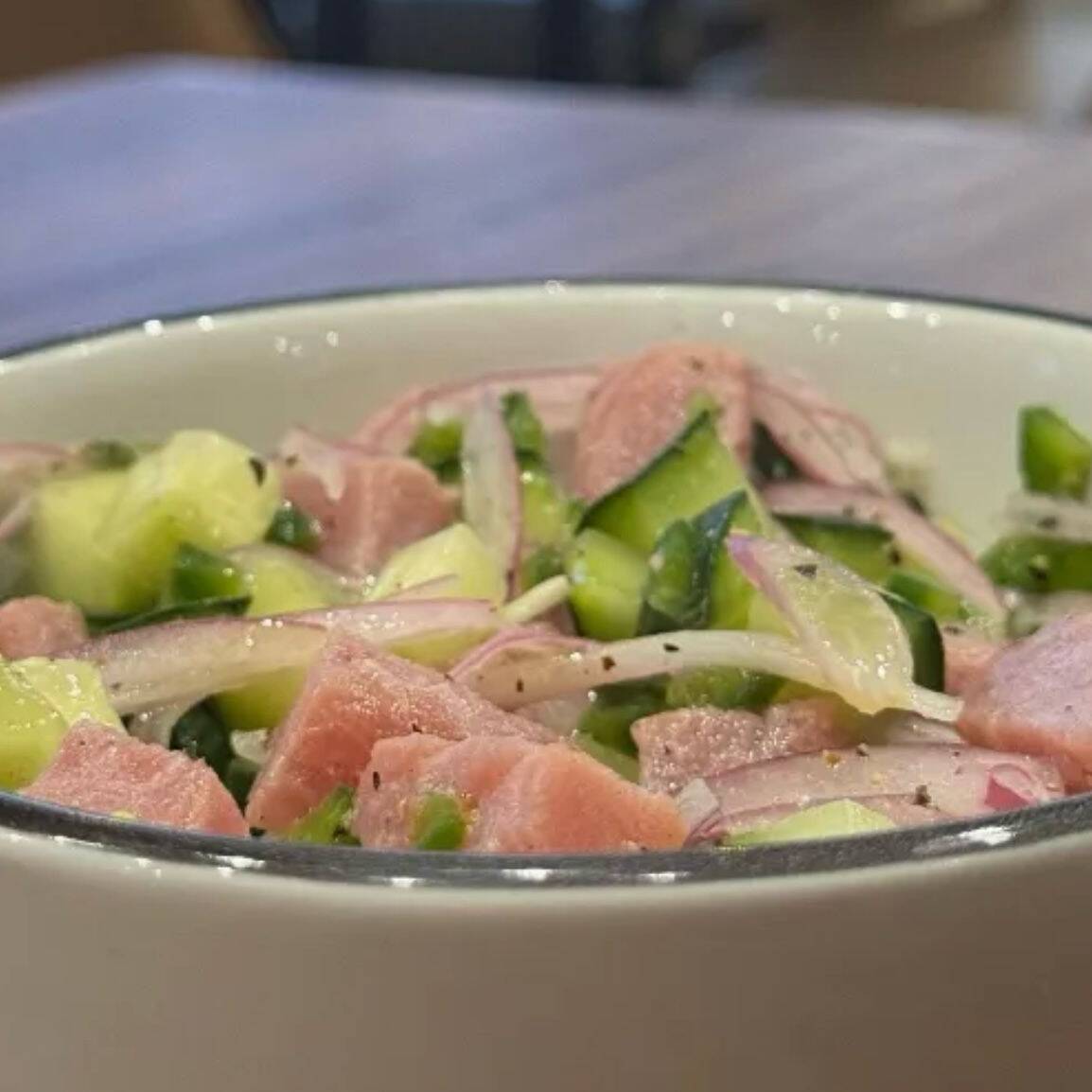 Atún fresco, salsa de soya, jugo de limón, aguacate, cebolla y cilantro.